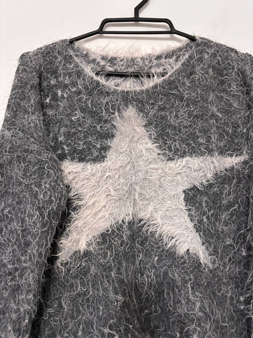 Ultra miękki, puszysty sweter typu "włochacz" z dużą białą gwiazdą na przodzie i delikatnym gradientem na dole. Dzianina z angorą (50% angora, 50% poliamid) – bardzo ciepła, milutka w dotyku, lekko "kosmaty" efekt. Luźny oversize’owy krój, obniżone ramiona, okrągły dekolt, długi rękaw.