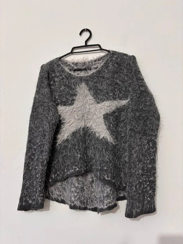 Ultra miękki, puszysty sweter typu "włochacz" z dużą białą gwiazdą na przodzie i delikatnym gradientem na dole. Dzianina z angorą (50% angora, 50% poliamid) – bardzo ciepła, milutka w dotyku, lekko "kosmaty" efekt. Luźny oversize’owy krój, obniżone ramiona, okrągły dekolt, długi rękaw.