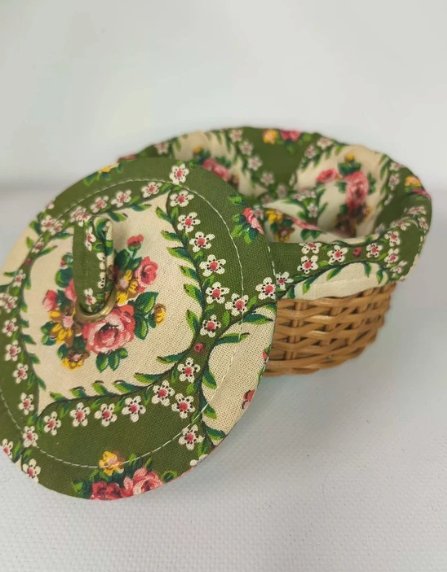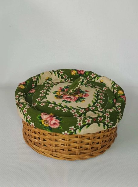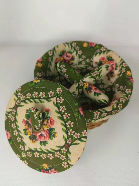 Uroczy koszyczek z obszyciem, puzderko na przybory krawieckie. W środku przegródki.