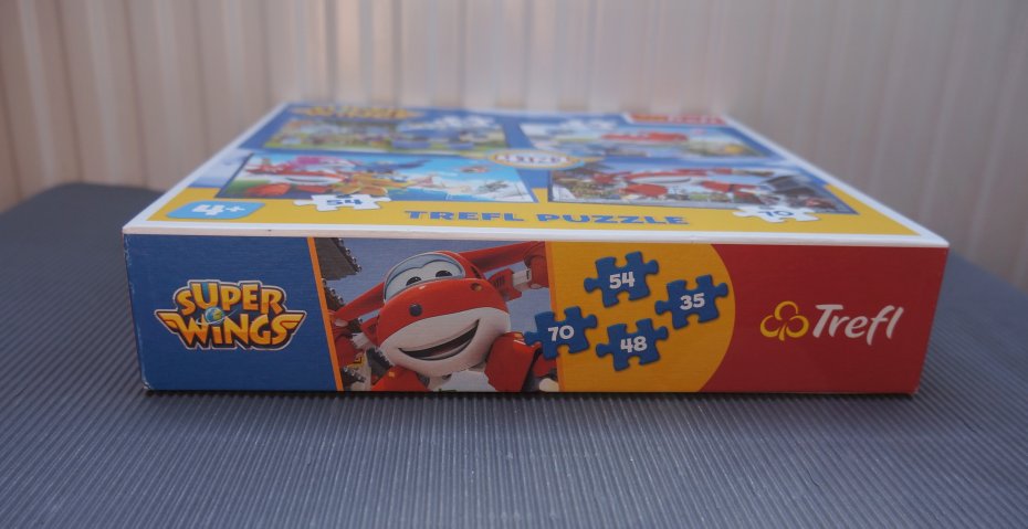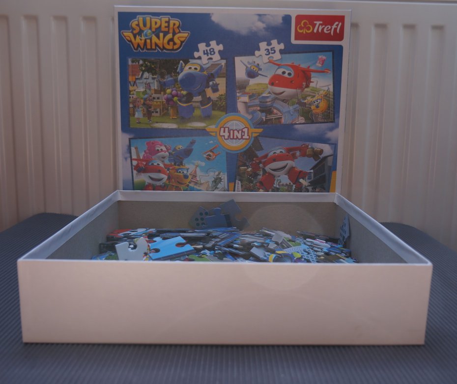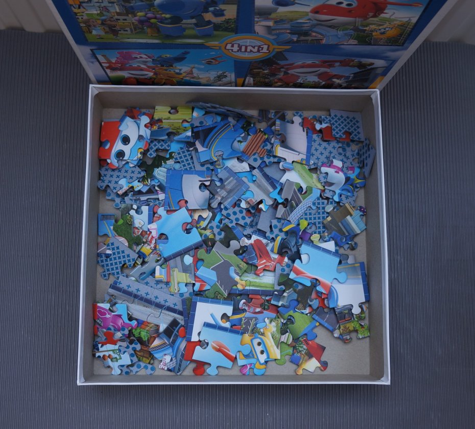 Nie jedna, nie dwie, ale aż cztery układanki zamknięte w jednym pudełku to prawdziwa gratka dla miłośników puzzli! Po ułożeniu otrzymamy cztery obrazki różnej wielkości z postaciami bajki Super Wings Odlotowa Paczka. Stan bardzo dobry.