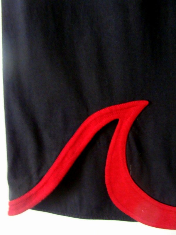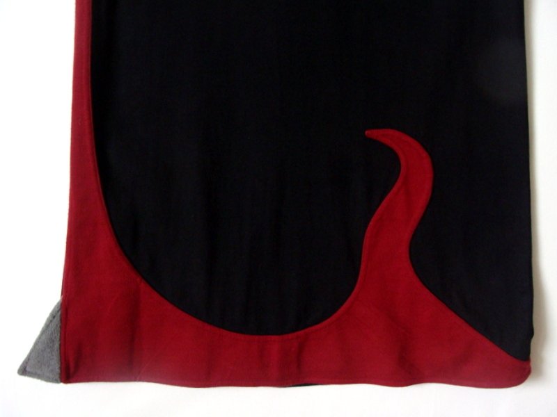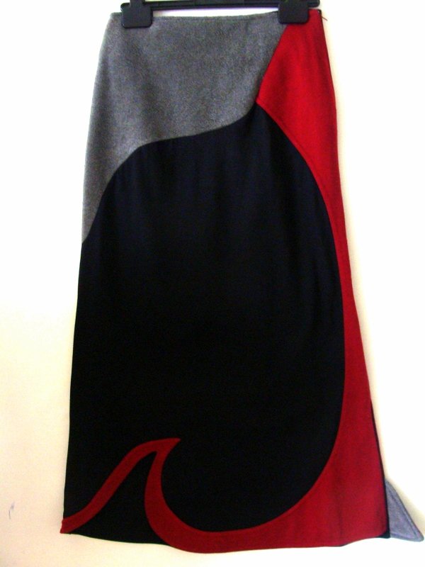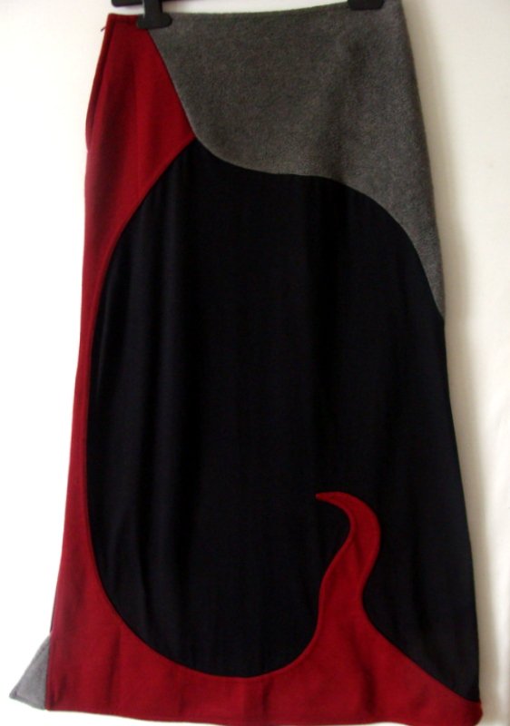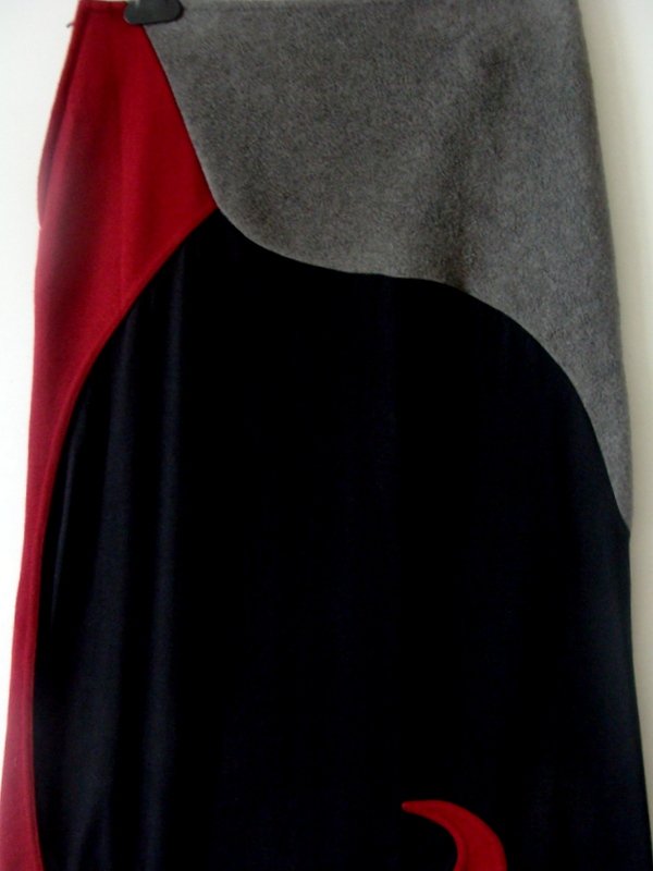Długa spódniczka z łączonych materiałów: jasnoszarego polaru, bawełnianej czarnej dzianiny i czerwonej dzianiny poliestrowo- bawełnianej . Zapinana z boku na zamek.
