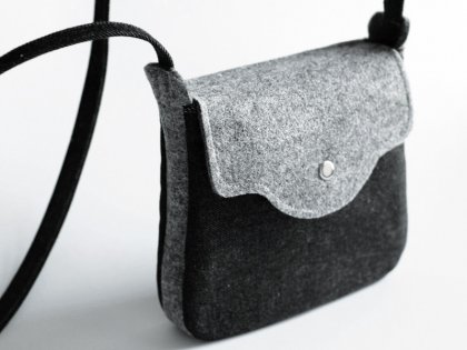 Mała oryginalna torebka na ramię. Wykonana z czarnego dżinsu oraz grubego filcu (4 mm). Wewnątrz podszewka oraz kieszonka z filcu na telefon. Zamykana na magnes. Wymiary: wys 17 cm, szer 18 cm, gł ok 4 cm, dł paska na ramię ok 120 cm.