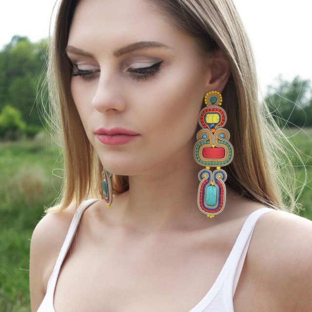 Kolczyki wykonane metodą haftu soutache. Etniczne i spektakularne.