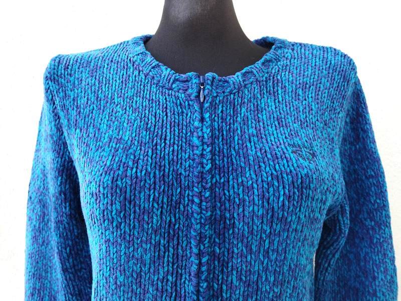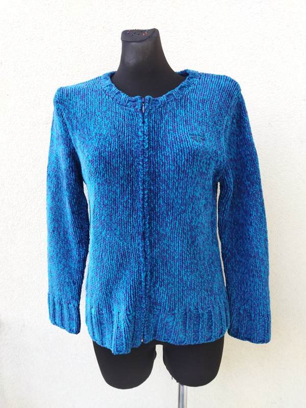 Przyjemny szenilowy sweter typu kardigan z mięsistej akrylowej włóczki w dwóch odcieniach koloru niebieskiego: szafiru i kobaltu. Zapinany na zamek. Wykończony ściągaczami
