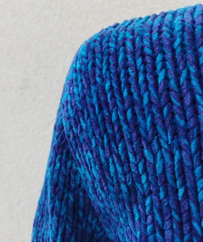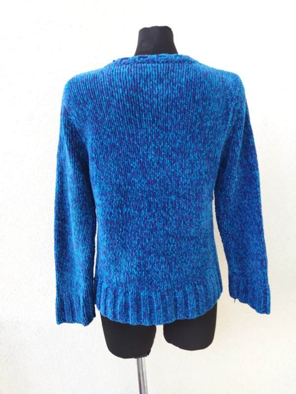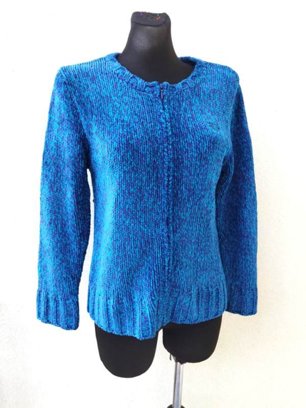 Przyjemny szenilowy sweter typu kardigan z mięsistej akrylowej włóczki w dwóch odcieniach koloru niebieskiego: szafiru i kobaltu. Zapinany na zamek. Wykończony ściągaczami