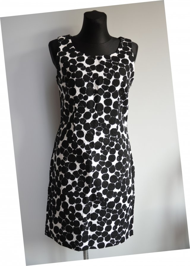 Elegancka sukienka znanej marki QUIOSQUE. Bardzo stylowa. Krój prosty, klasyczny. Bardzo ładny, modny białoczarny plamisty wzór. Zapinana na boczny zamek. W tali zaszewki profilujące. Na ramiączkach. Dobrze skrojona i świetnie się układa.