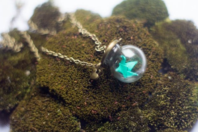 Delikatny, maleńki, papierowy żuraw - japoński symbol szczęścia, zdrowia i pokoju. Podobno, jeśli w jakiejś intencji złoży się tysiąc żurawich figurek, to życzenie się spełni. My spełniamy życzenia tym zjawiskowym wisiorkiem. Papierowy żuraw ukryty w szklanej kuleczce o najszerszej średnicy 2 cm. Część ozdobna zawieszona na łańcuszku o długości 36 cm. Całość w kolorze starego złota/brązu.
