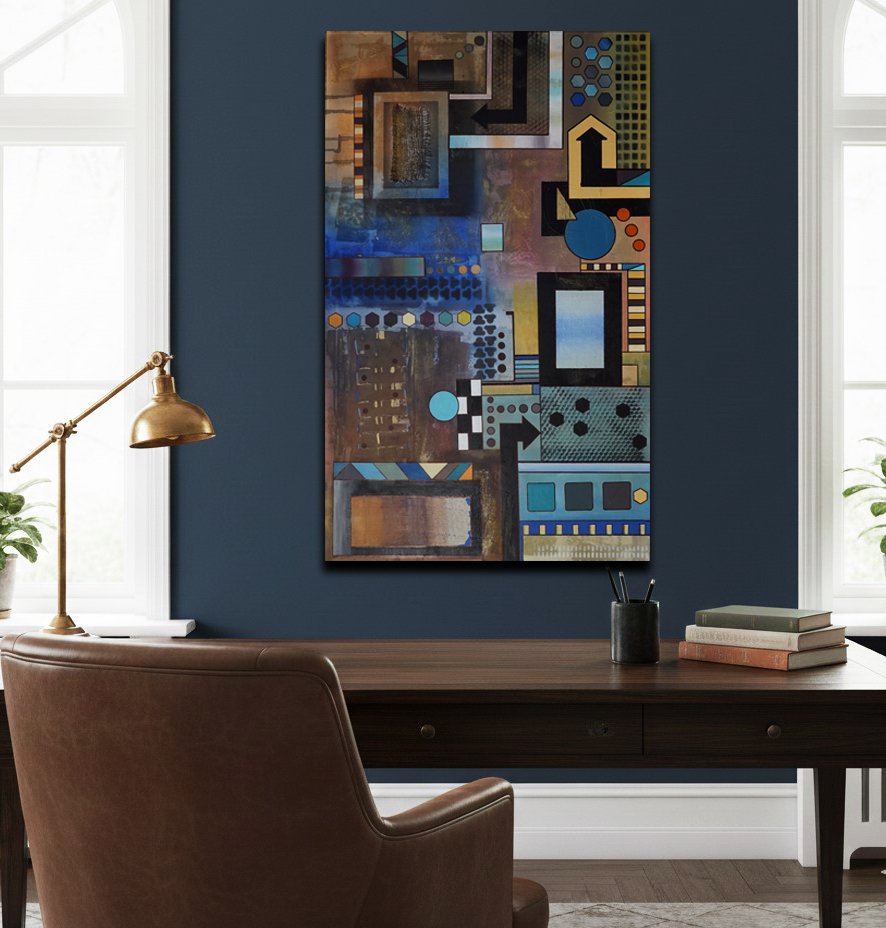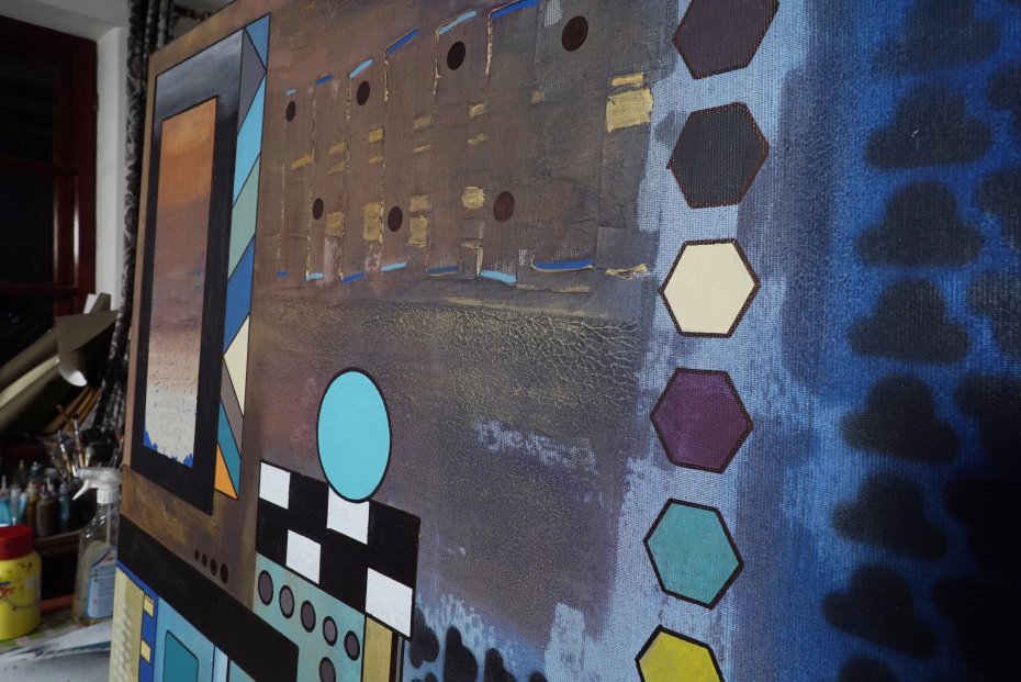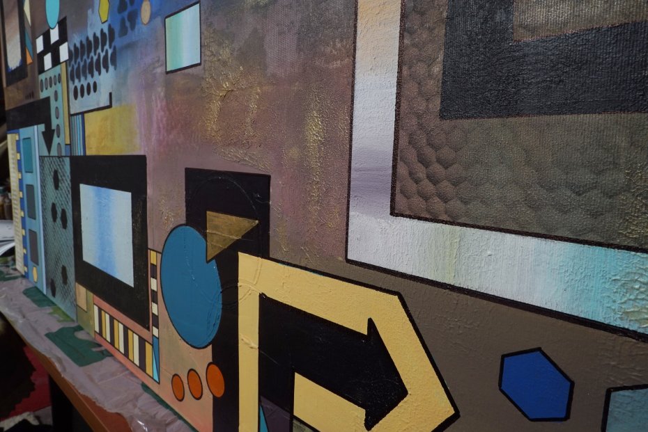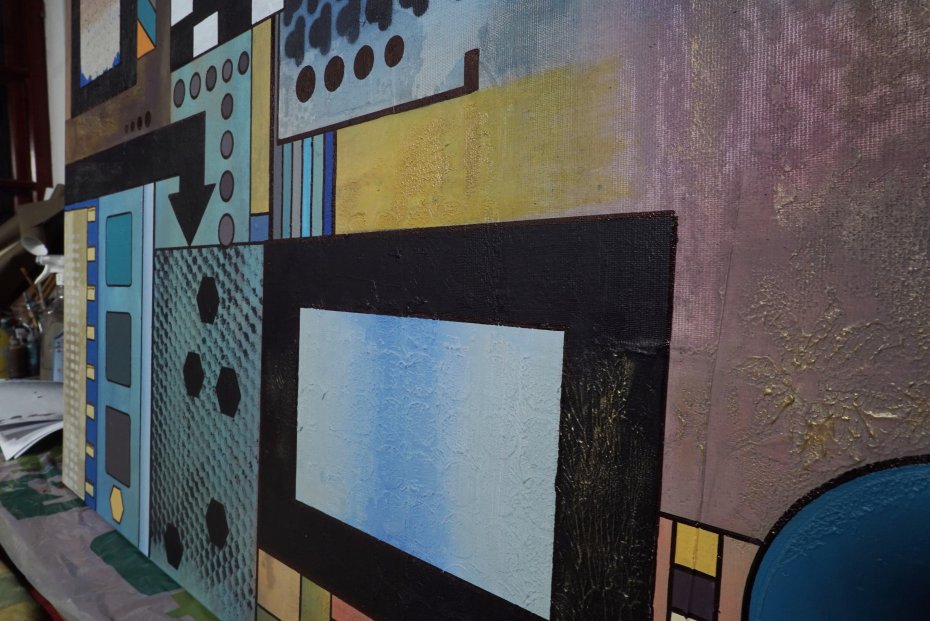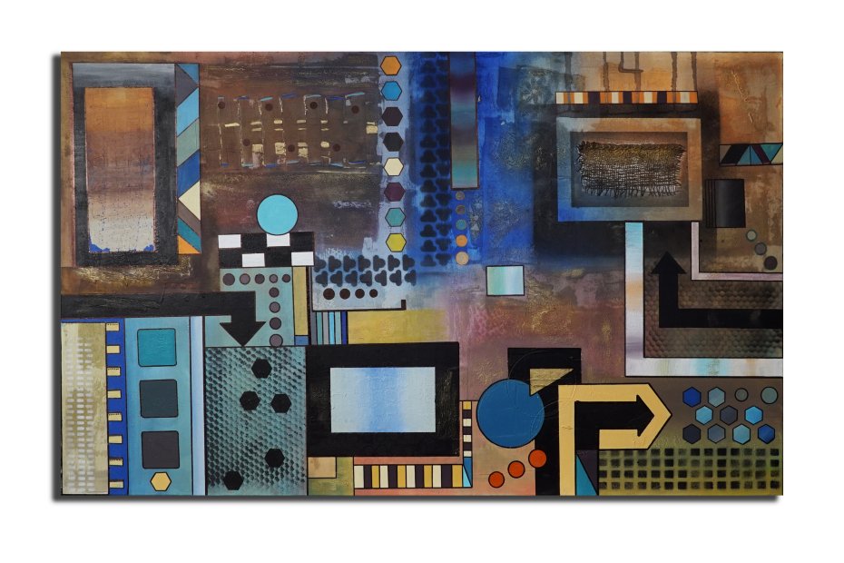 "Geometria abstrakcyjna 6" - płótno 120 x 80 cm ( pion lub poziom) Mixed media, boki zamalowane na czarno. Sygnatura z tyłu obrazu. .