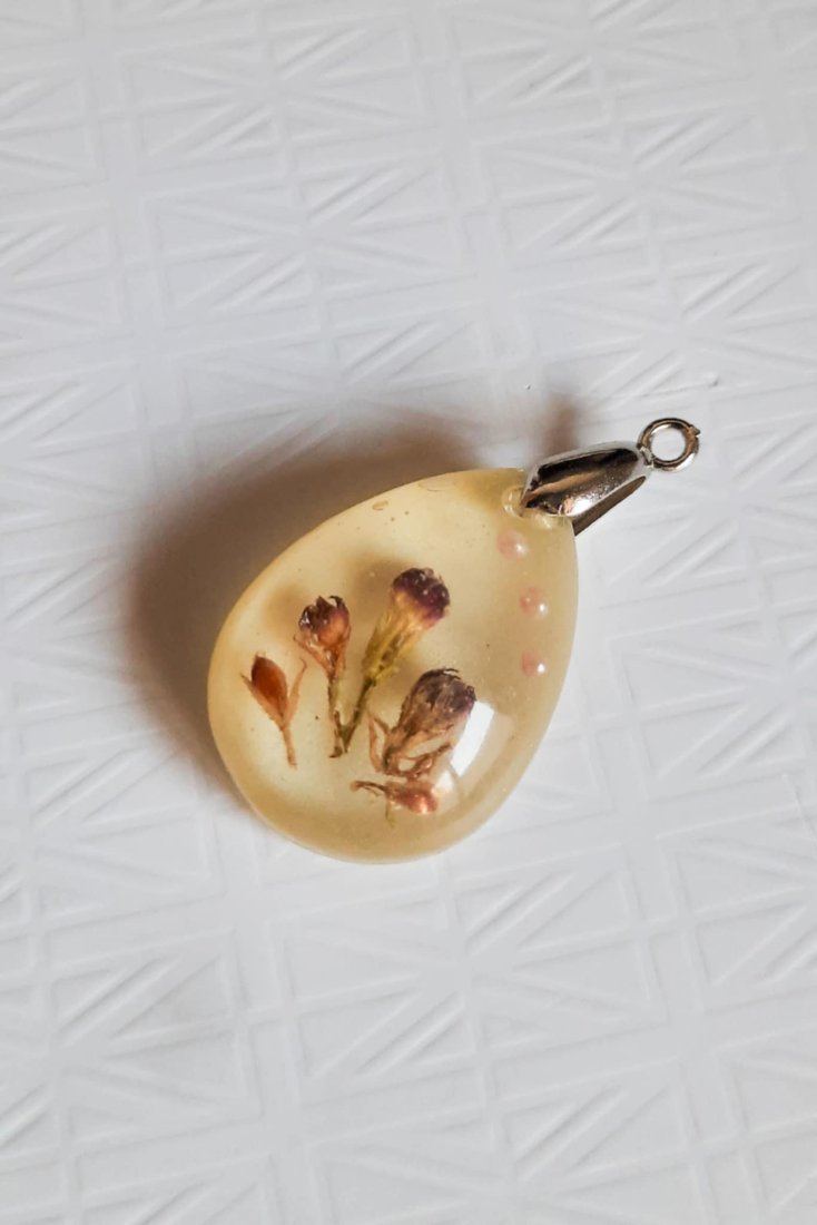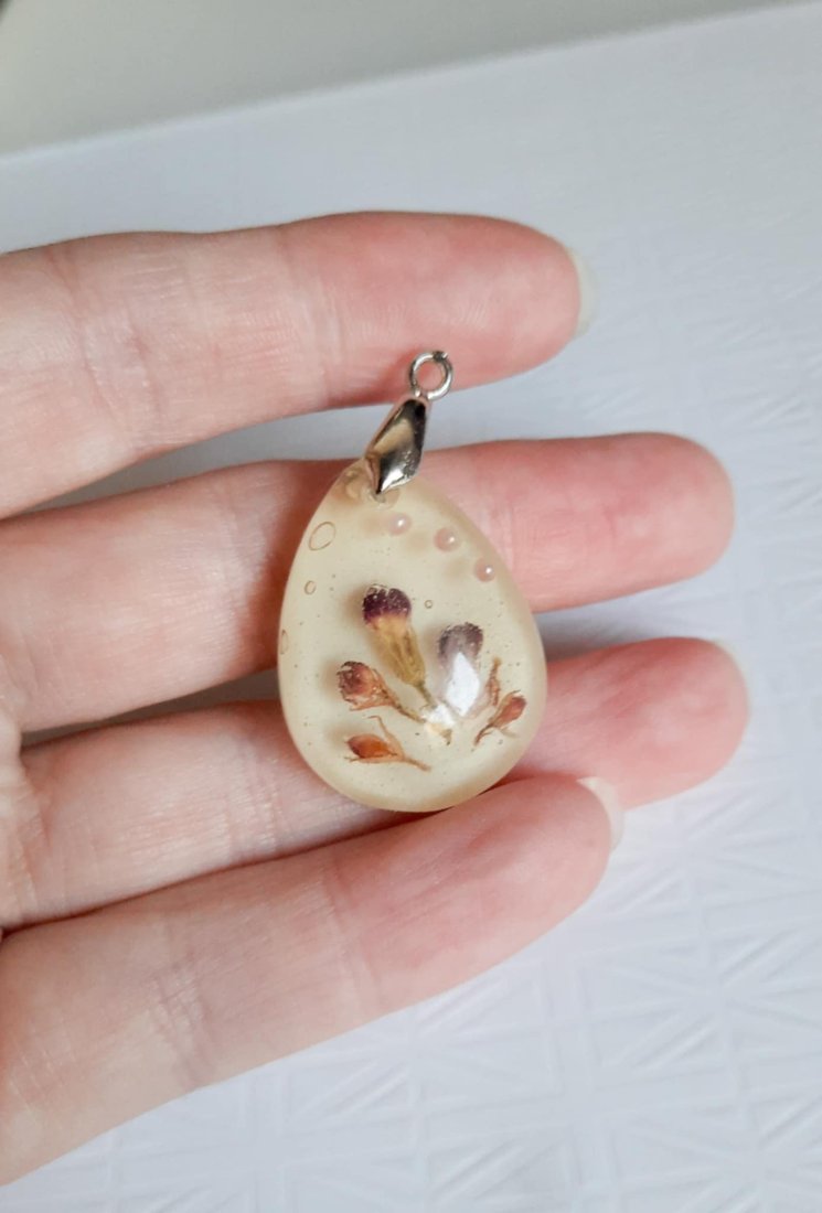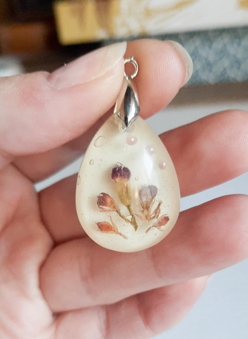 Ręcznie wykonany wisiorek z kremowej żywicy z zatopionymi kwiatami ze srebrnym wykończeniem. Idealny do różnych ubrań, pięknie się prezentuje. Unikatowa biżuteria to idealny prezent dla ukochanej osoby, ale także idealna ozdoba dla samej siebie :)
