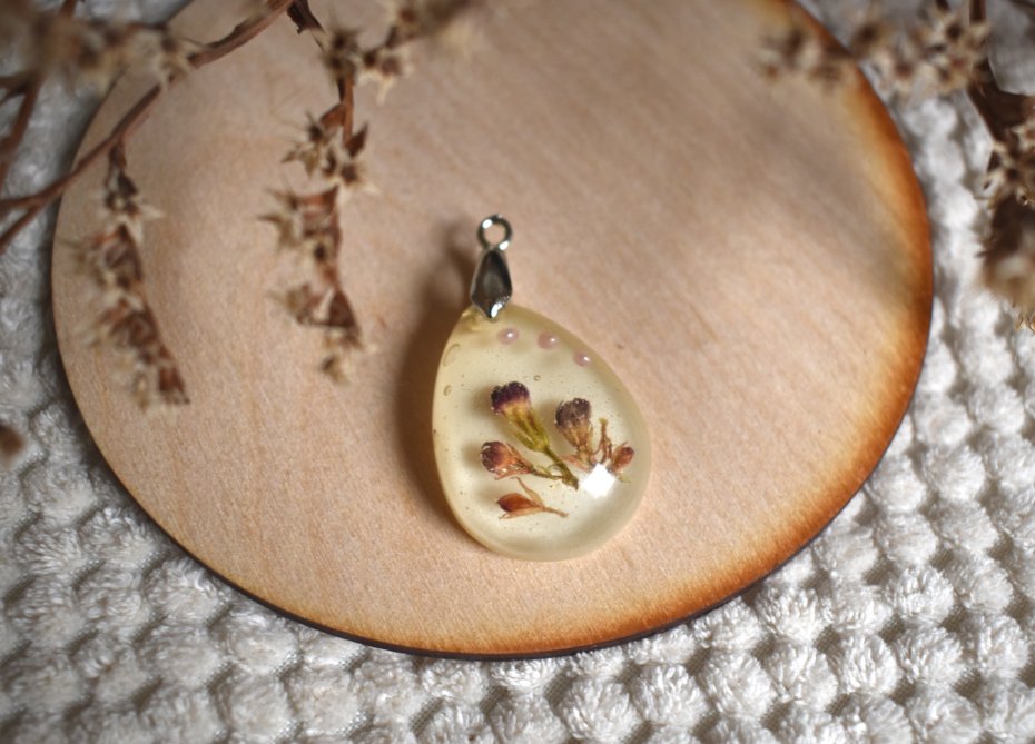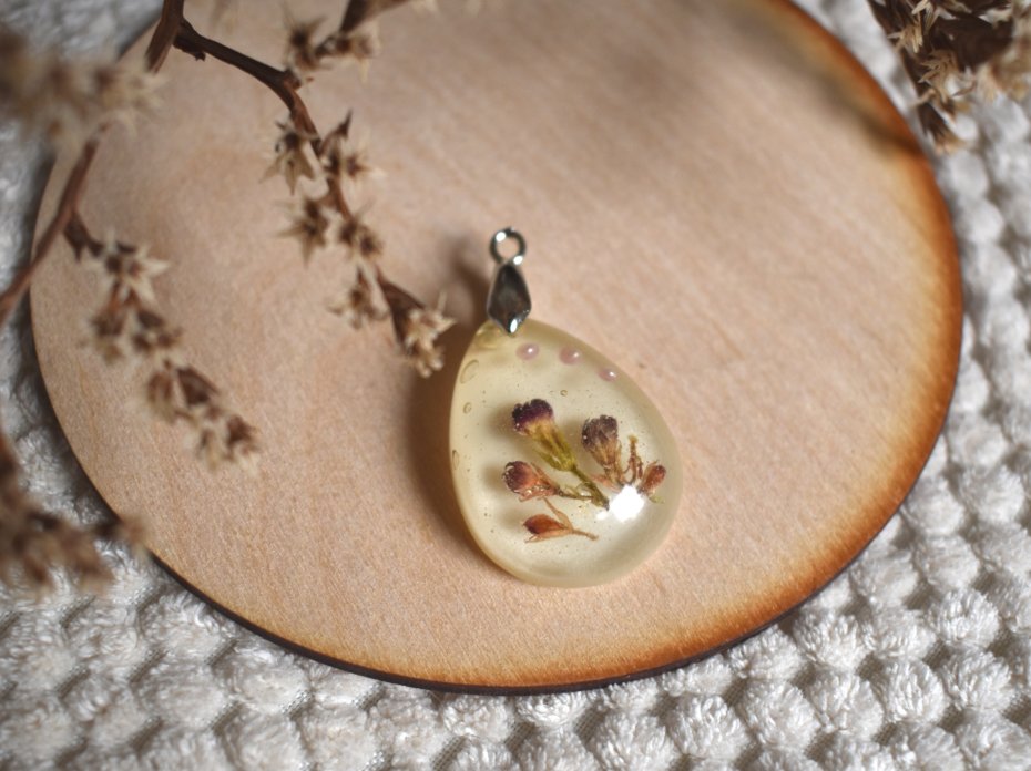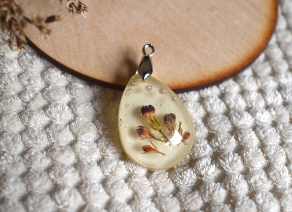 Ręcznie wykonany wisiorek z kremowej żywicy z zatopionymi pączkami kwiatów. Srebrne wykończenie (możliwość zamiany na złote). Idealny do różnych ubrań, pięknie się prezentuje. Unikatowa biżuteria to idealny prezent dla ukochanej osoby, ale także idealna ozdoba dla samej siebie :)