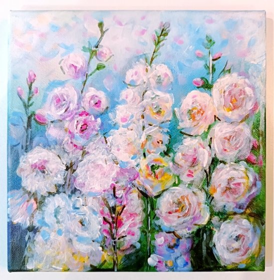 Ten autorski obraz, utrzymany w łagodnej, pastelowej gamie, przenosi wprost do cichego, kwitnącego ogrodu. Miękkie pociągnięcia pędzla oraz harmonijne połączenie różu, błękitu i lawendy tworzą atmosferę spokoju oraz domowego ciepła.