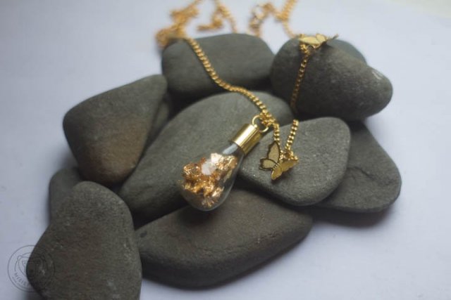 Delikatny, maleńki, wypełniony płatkami złota, które skrywa szklana kropelka o najszerszej średnicy 1,8 cm. Część ozdobna zawieszona na łańcuszku z motylkami o długości 32 cm. Całość w kolorze złota.