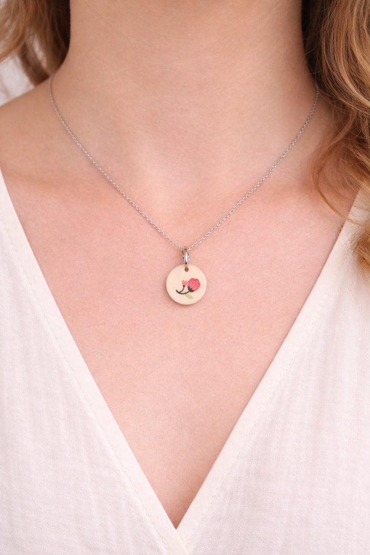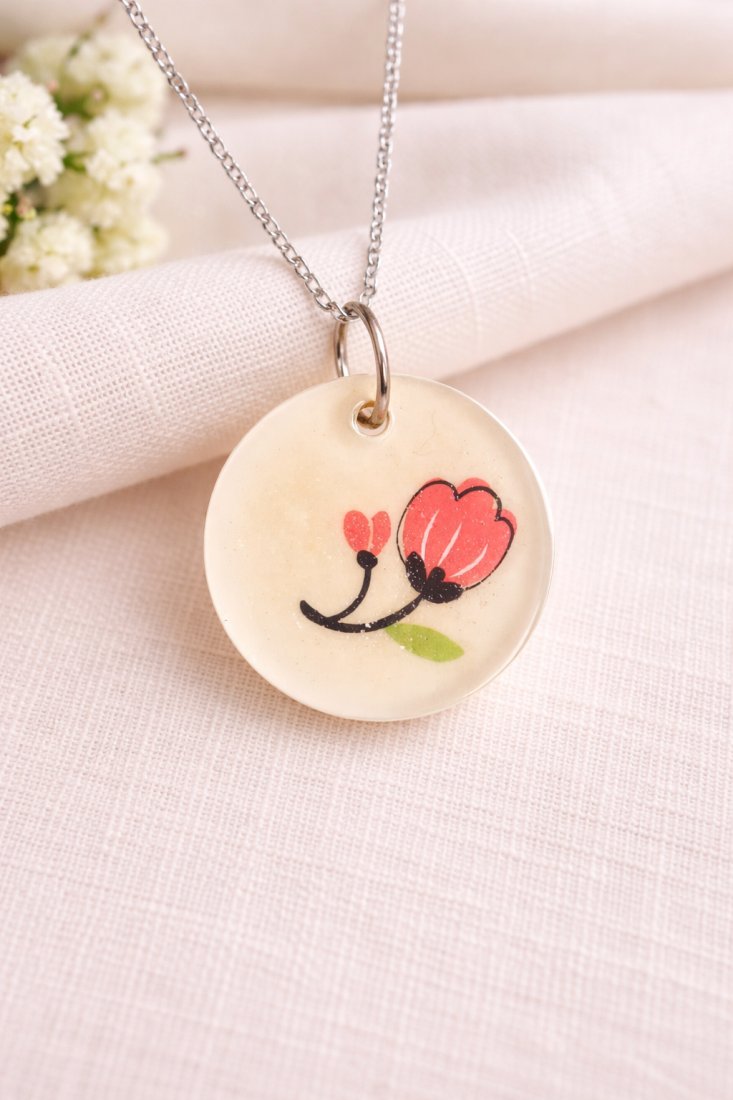 Ręcznie wykonany wisiorek z białej żywicy z zatopioną grafiką różowego tulipana. Srebrne wykończenie. Idealne do różnych stylizacji, pięknie się prezentuje. Unikatowa biżuteria to idealny prezent dla ukochanej osoby, ale także oryginalna ozdoba dla samej siebie :)
