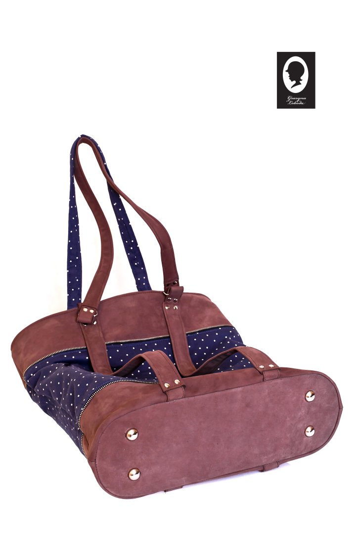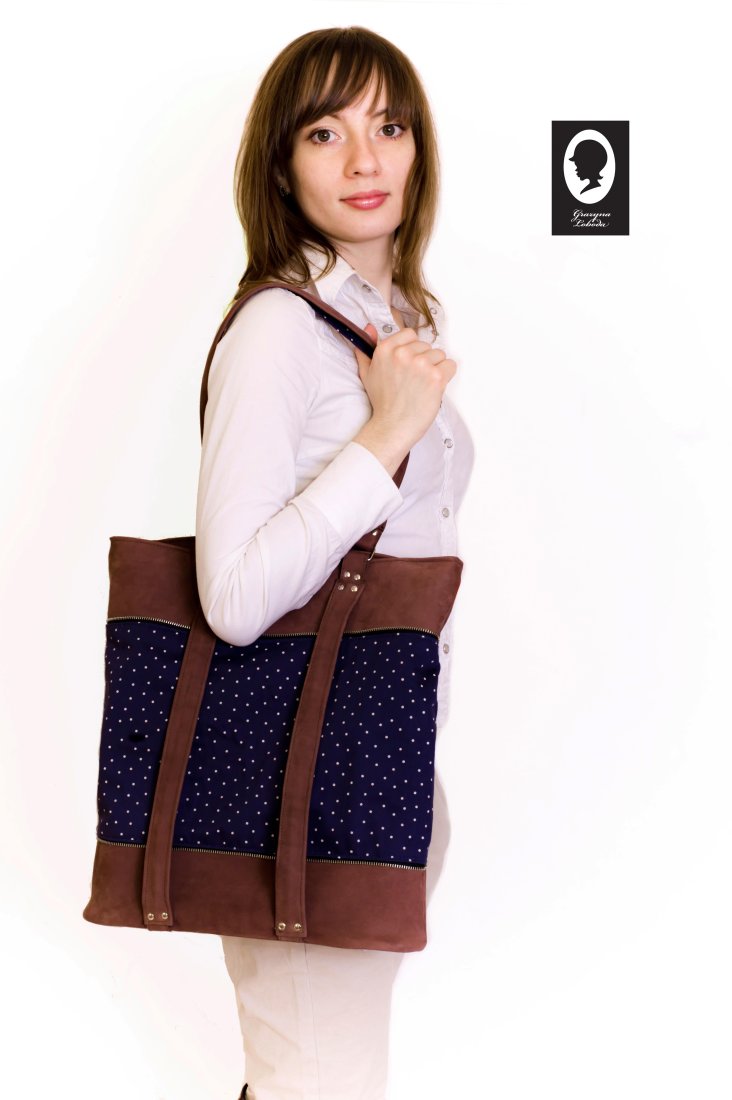 Torebka wykonana ze skóry naturalnej w połączeniu z bawełnianą tkaniną. W miejscu łączenia materiałów ozdobiona metalowym zamkiem. Zapinana na metalowy zamek o długości 30 cm. Wzdłuż torby cztery pasy – 2 z przodu i 2 z tyłu. Stanowią one optyczną kontynuację uchwytów. Przymocowane są (jak również uchwyty) metalowymi nitami.