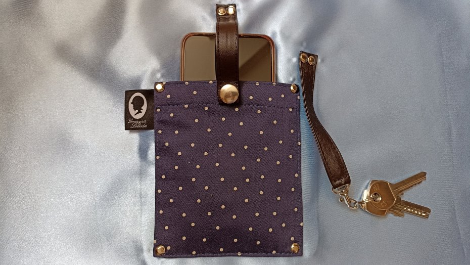 We wnętrzu błękitna podszewka. W niej dwie kieszenie. Mniejsza wyposażona w pasek z napą do zapięcia telefonu, oraz pasek z karabińczykiem służący do przypięcia kluczy (szykanie kluczy w przepełnionej, damskiej torebce :DDD).