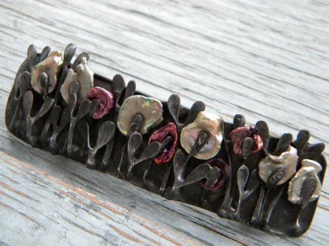 klamra wykonana z ocynowanej miedzi i pereł.stylizowana na stare srebro. wymiary frontu 9,7cm x 3,4cm.Klamra posiada trzystopniową regulację zapięcia, przez co dopasuje się do każdej ilości włosów.Polecam!