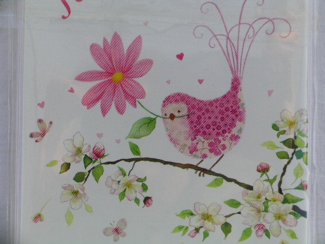 Pakiet czterech niewielkich pocztówek z kopertami. Wszystkie z tym samym, radośnie ptasim obrazkiem wiosennym :)
