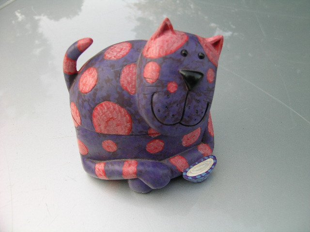 Fantastycznie kocie puzderko z lekkiej masy, ręcznie malowane, na satynowo lakierowane. Kot przezabawny i bardzo uśmiechnięty :) 9,5 x 7,5 x 8 cm. Stan zachowania bardzo dobry.