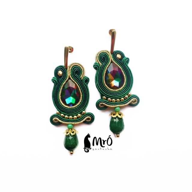 Kolczyki wykonane w technice haftu Soutache w pięknych kolorach szmaragdu, zieleni i złota.