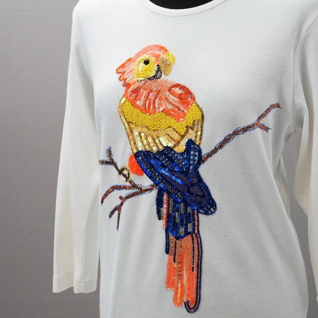 Przepiękna bluzka najwyższej jakości ozdobiona mozolnie wykonaną z koralików i cekinów papugą.