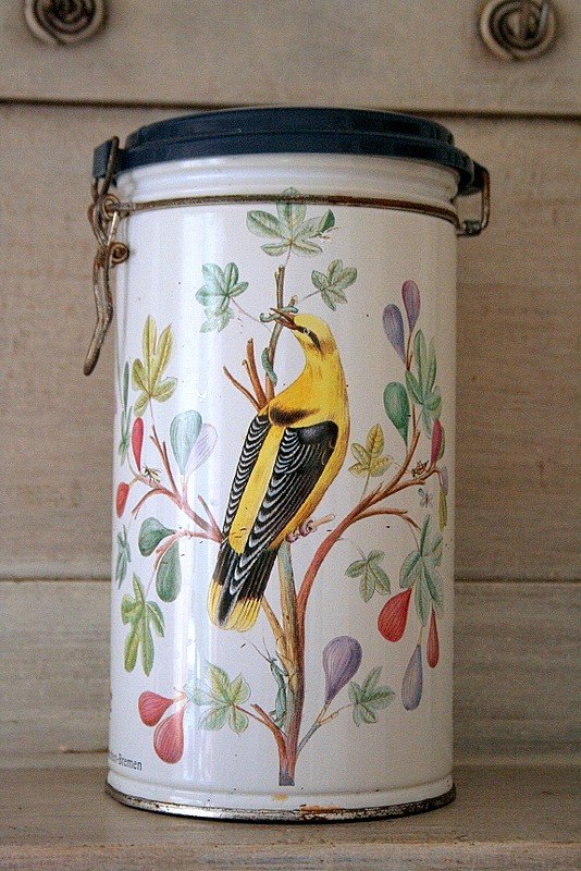 Ciekawa, stara metalowa puszka po kawie z motywem uroczych rajskich ptaków. Idealna do wnętrz w stylu vintage...