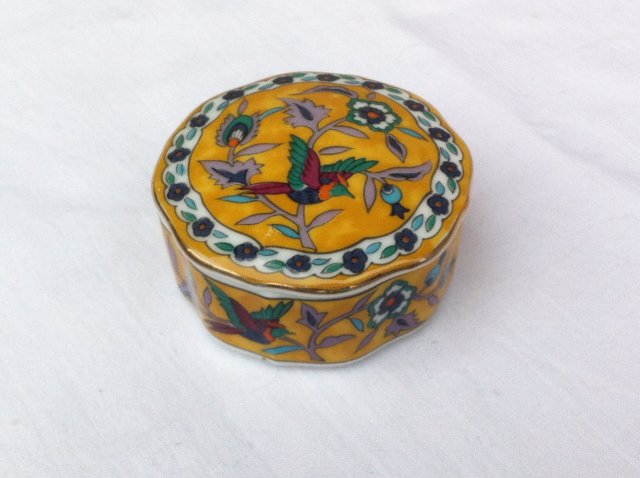 Małe porcelanowe puzderko od St. Michael. Żywość barw i ptasio-rajski motyw. Na drobne skarby i ku uciesze :) Satynująco-błyszczące wykończenie. Przyjemnie dźwięczy :) 5 x 3 cm. Stan zachowania bardzo dobry.