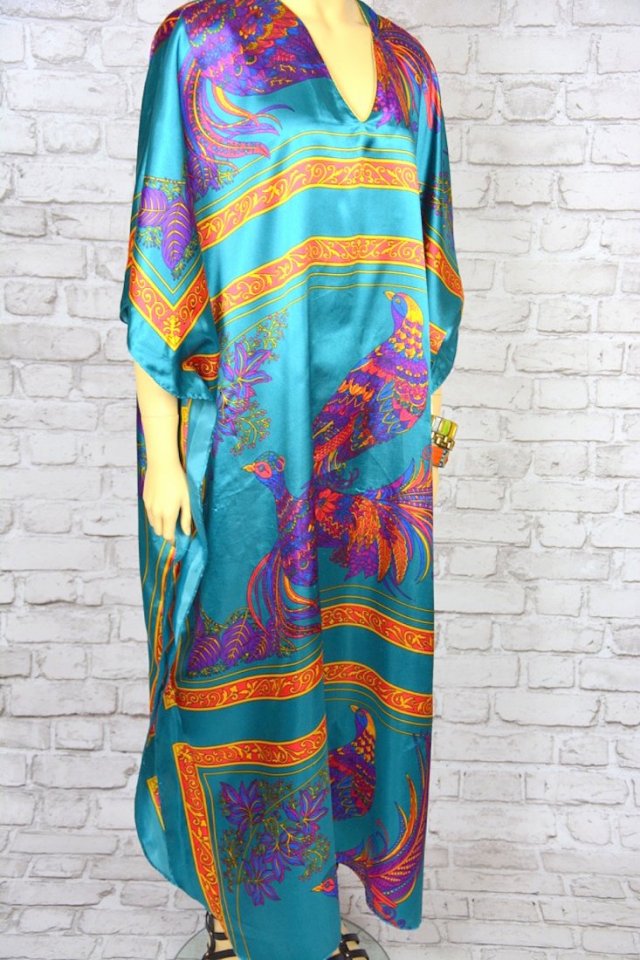 Piękna długa sukienka o kimonowym kroju w kolorze głębokiego turkusu w kolorowe duże efektowne printy ptaków, dekolt w serek obszyty cienką złoą lamówką, sukienka o luźnym ,swobodnym kroju, wykonana z satynowej tkaniny .