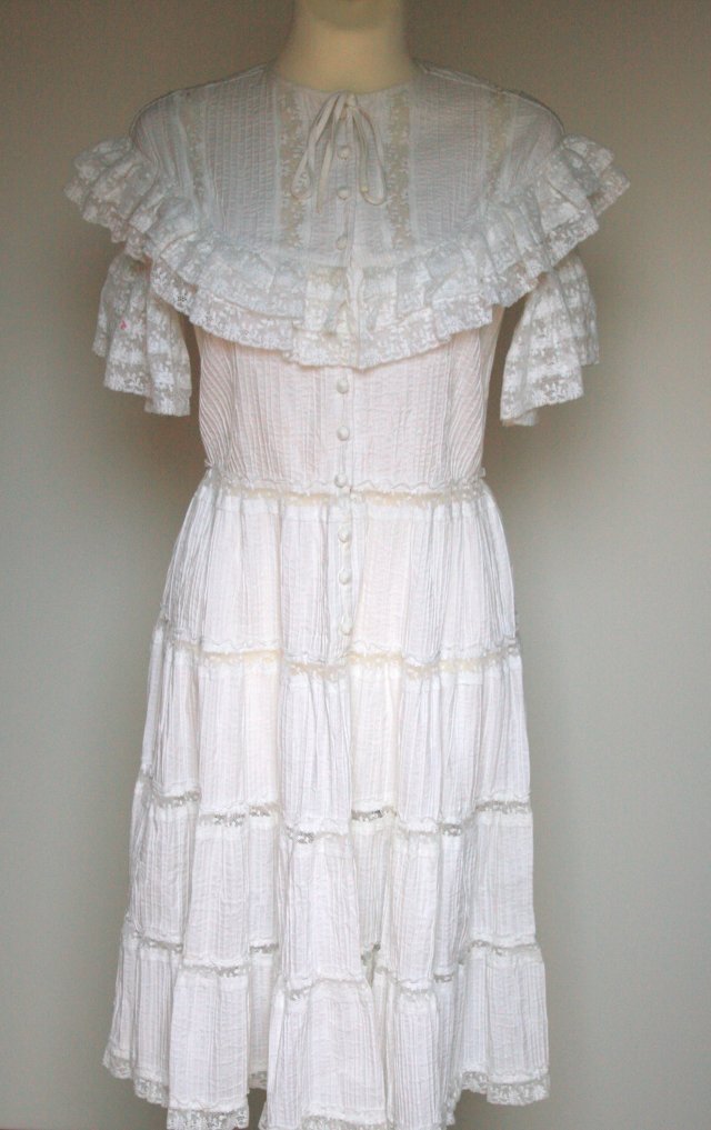 niezwykła designerska sukienka projektu Ralpha Laurena , połączenie koronki i sztywniejszej bawełny, zapinana z przodu na materiałowe guziki, wiązana pod szyją, krótkie szerokie koronkowe rękawki, lekko prześwitująca, niesamowicie oryginalna