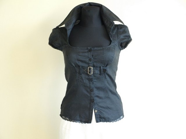 Mała czarna bluzeczka, bardzo dziewczęca, wykończona koronką przy rękawkach i na dole bluzki. Marka Watcher, materiał to 100% ramia (naturalne włókno pokrzywy przypominające len, bardziej sztywne). Piękny dekolt, biust modelowany cięciami. Detale widoczne na zdjęciach. Rozmiar 34, Stan bardzo dobry, jak nowa. Podaję wymiary mierzone na płasko;