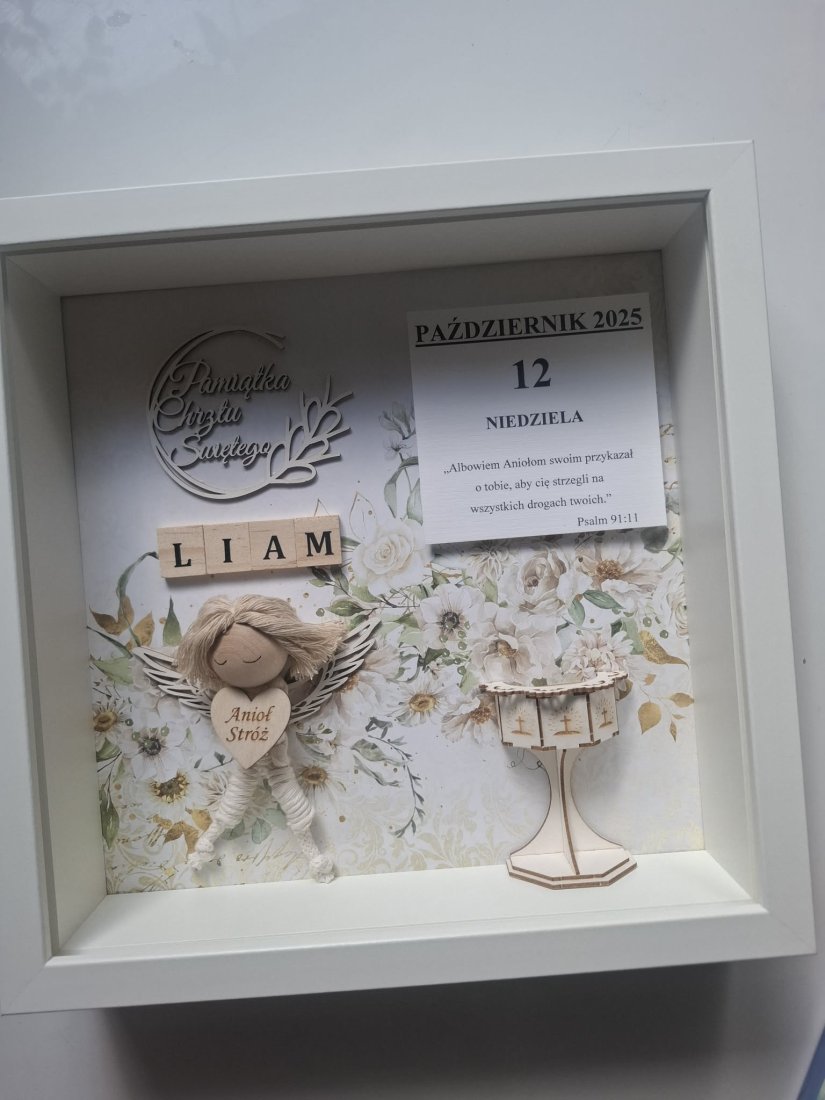 Wewnątrz ramki znajduje się makramowy anioł stróż, imię, miniaturowa chrzcielnica oraz kartka z kalendarza z cytatem.