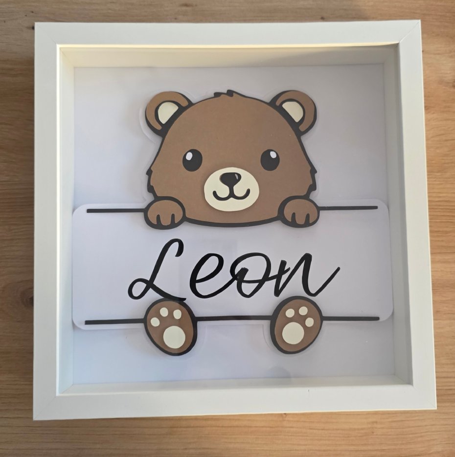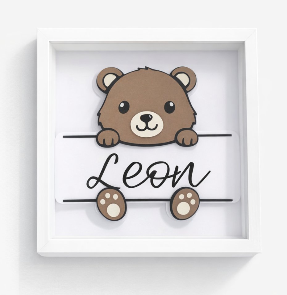 Ta ramka to połączenie nowoczesnego designu, ręcznego wykonania i personalizacji, które sprawiają, że staje się niepowtarzalną ozdobą dziecięcego wnętrza. Miś wykonany w technologii 3D wygląda, jakby wychylał się zza tabliczki z imieniem – efekt przestrzenny przyciąga wzrok i dodaje głębi całej kompozycji.
