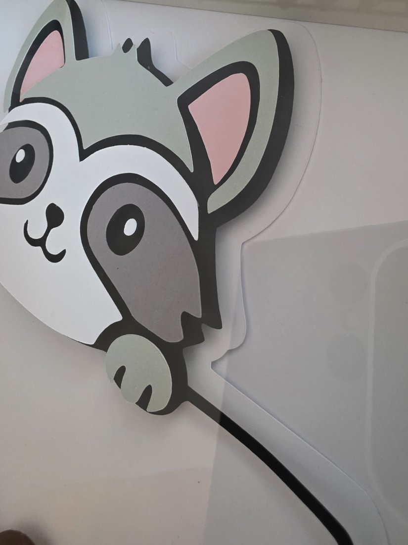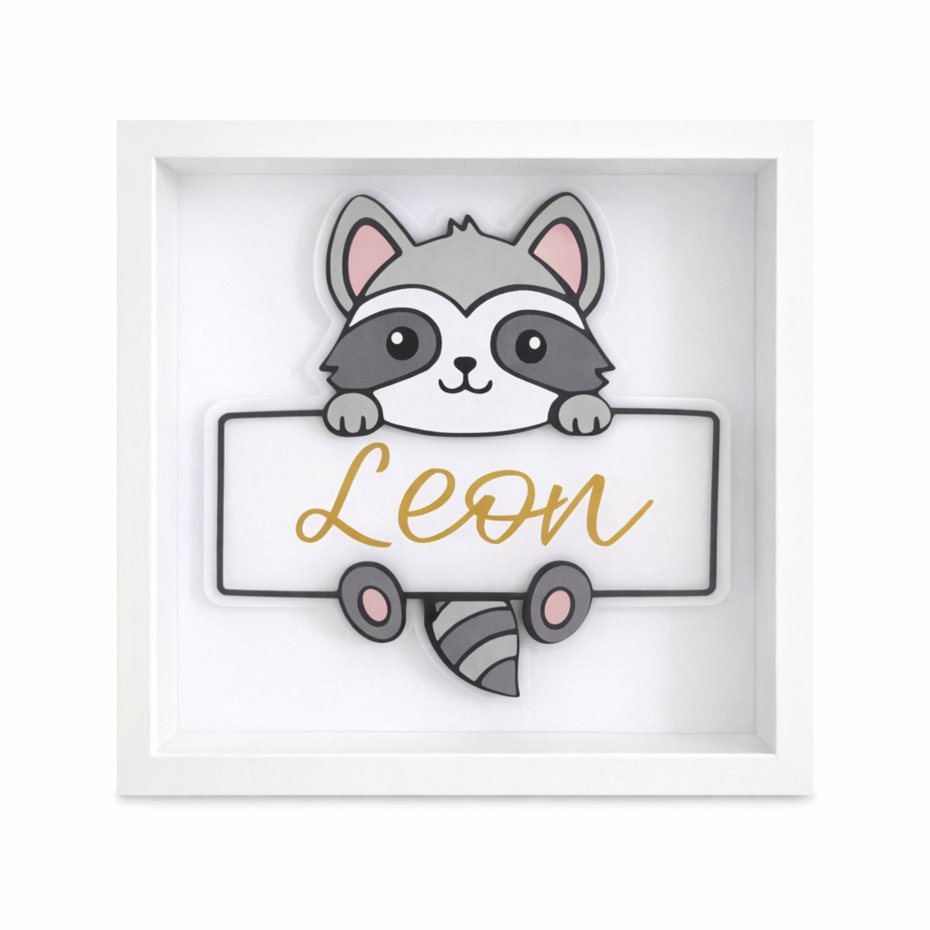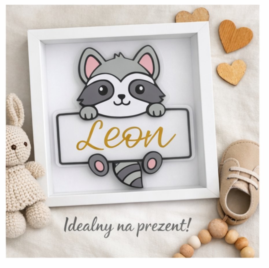 Uroczy szop trzymający tabliczkę z imieniem sprawia, że ramka staje się wyjątkową pamiątką na lata.