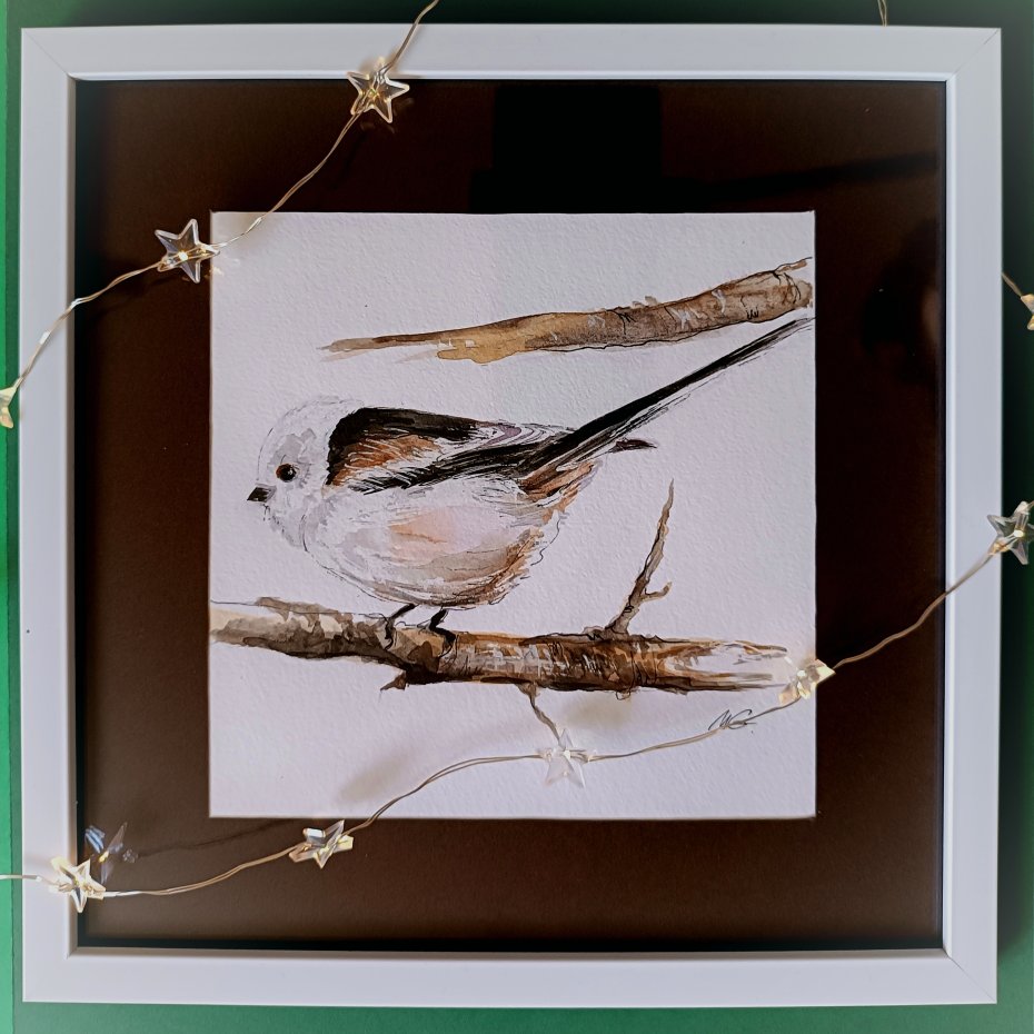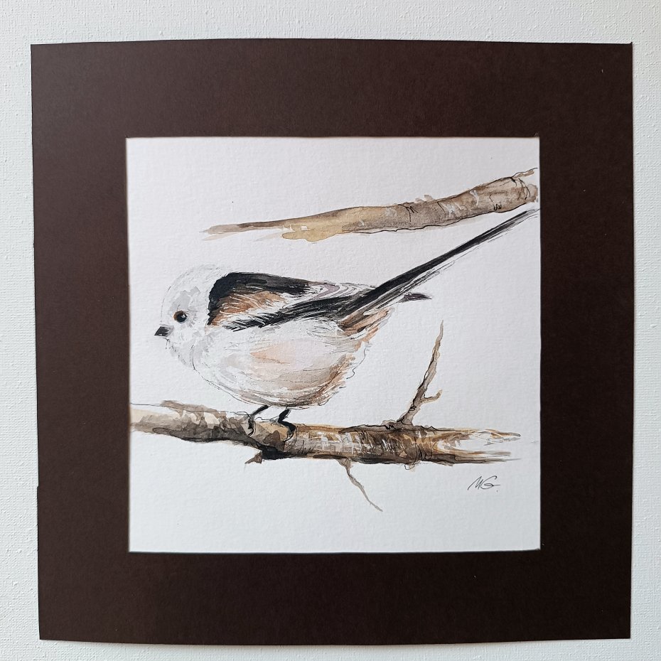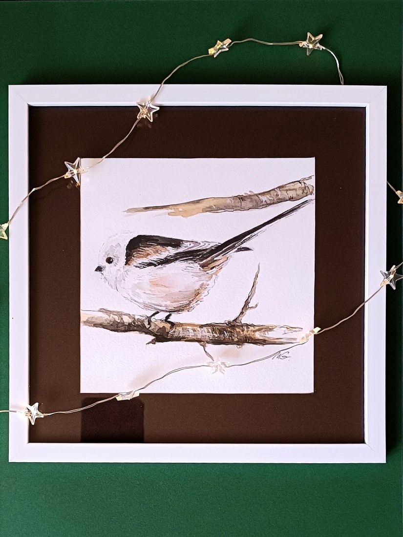 Śliczny Raniuszek. Akwarela namalowana na papierze 250g z użyciem cienkopisów Winsor&Newton, gellpen Sakura i POSCA i farb Derwent. Akwarelka oprawiona jest w passe-partou i ramę za szkłem. Posiada podpórkę,więc może też stać. Wymiar całości 21,8 x 21,8cm, okienko pp 13,7x13x7cm