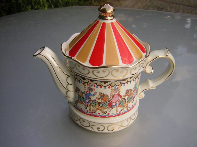 Nieprawdopodobny Porcelanowy Imbryk sygnowany SADLER z indywidualnyumi numerami 4399Ti Reg. Design No. 2005895 Satffordshire England Edwardian entertainments CAROUSEL. Ciekawa forma i bogate zdobienie. Trochę wesołego miasteczka ...karuzela i bogate zdobiegnie ucha, dziobka i zlote wykończenia. .Mocny, solidny, wyjatkowy i radosny. .Wygodne ucho, przykrywka z zabezpieczeniem przed wypadaniem.