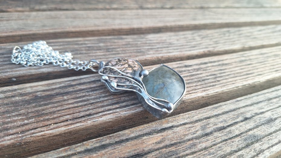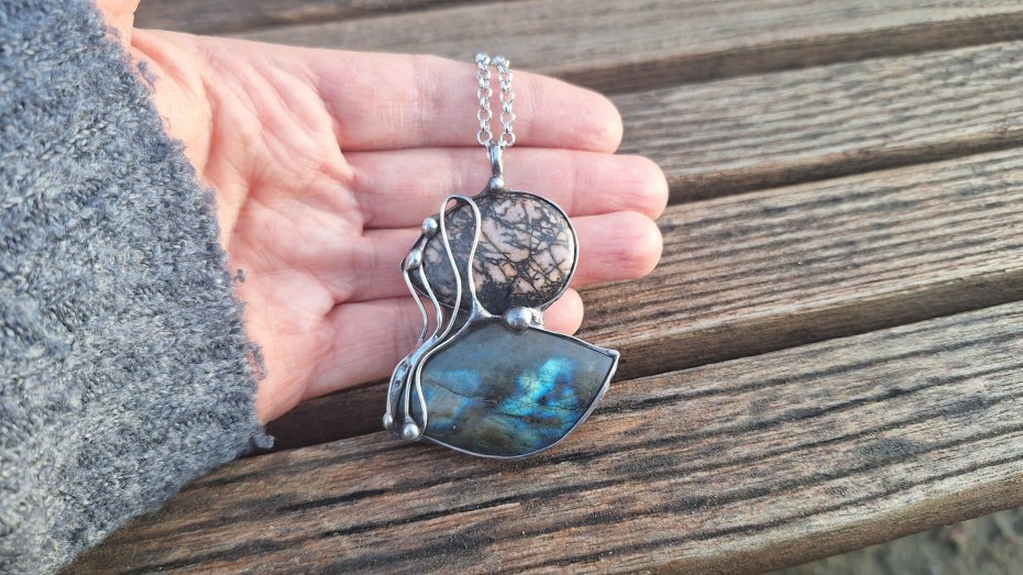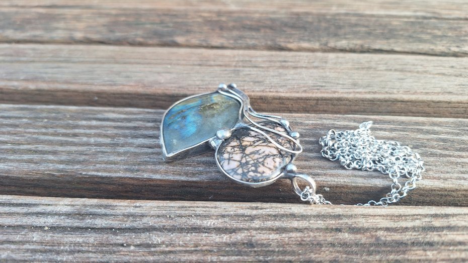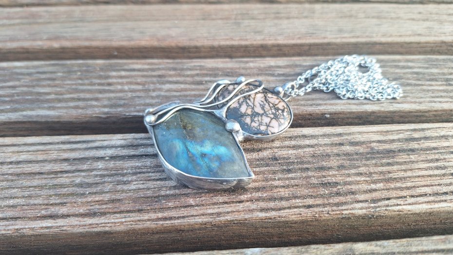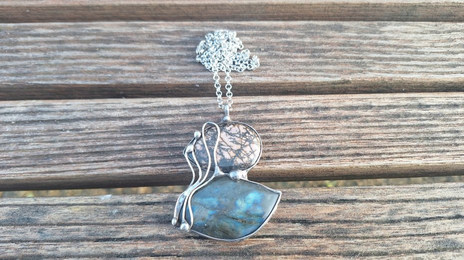 Wisiorek wykonany z miedzi, cyny, rodonitu i labradorytu. Wymiary ok. 5.5 na 4.5 cm. Zawieszony na łańcuszku o długości ok. 50 cm.