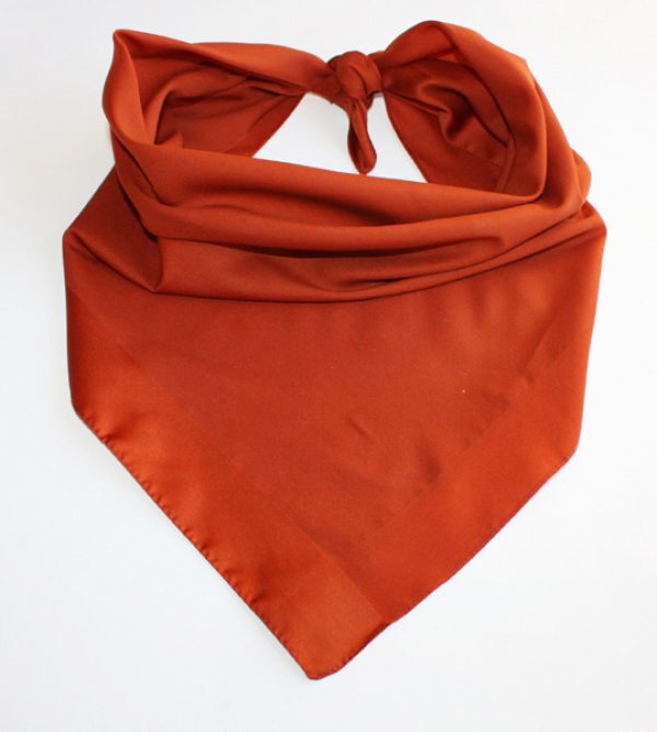 Rdzawa, gładka chusta wykonana prawdopodobnie z poliestru.