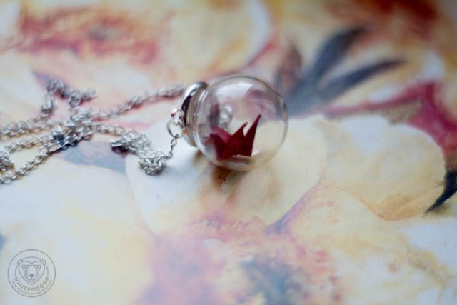 Delikatny, maleńki, papierowy żuraw - japoński symbol szczęścia, zdrowia i pokoju. Podobno, jeśli w jakiejś intencji złoży się tysiąc żurawich figurek, to życzenie się spełni. My spełniamy życzenia tym zjawiskowym wisiorkiem. Papierowy żuraw ukryty w szklanej kuleczce o najszerszej średnicy 2 cm. Część ozdobna zawieszona na łańcuszku o długości 36 cm. Całość w kolorze srebra.