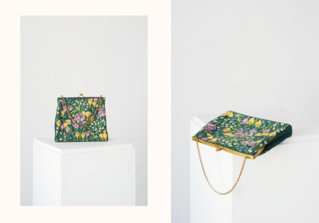 Piękna torebka vintage do ręki na krótkim łańcuszku. Na zewnątrz gobelinowy motyw kwiatowy, w środku atłasowa wyściółka w kolorze oliwkowym.