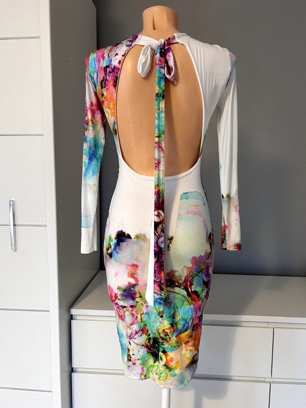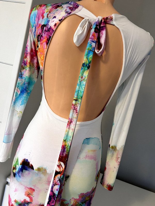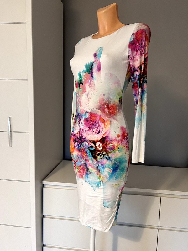 Piękna biała sukienka Rebecca Rhoades rozmiar S. Cena sklepowa, ponad 1500 zł. Niezwykle oryginalna, kolorowy, tęczowy print, wzór. Posiada podszewkę, jest więc masywna, pięknie się przez to układa. W niej nie przejdziesz niezauważona