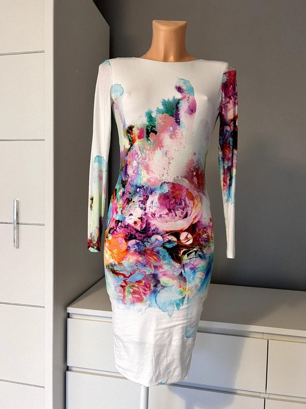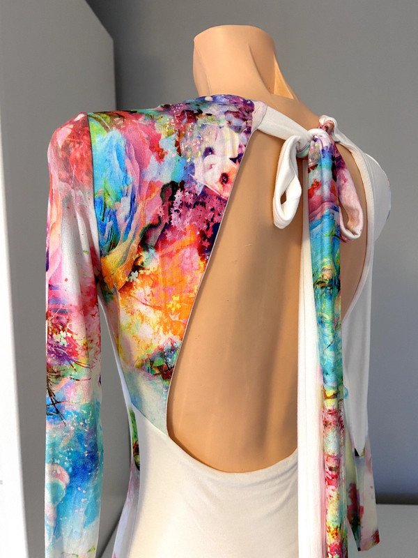 Piękna biała sukienka Rebecca Rhoades rozmiar S. Cena sklepowa, ponad 1500 zł. Niezwykle oryginalna, kolorowy, tęczowy print, wzór. Posiada podszewkę, jest więc masywna, pięknie się przez to układa. W niej nie przejdziesz niezauważona