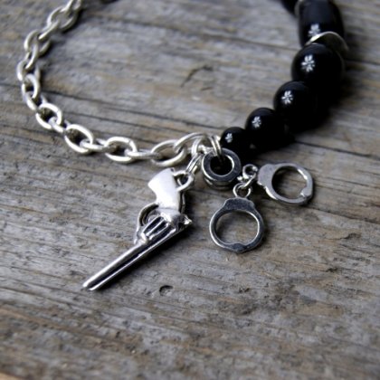 Wykonana została z onyksu w różnych kształtach oraz elementów posrebrzanych i metalowych (metal antyalergiczny). Całkowita dł bransoletki to ok. 23 cm, dł. części pokrytej koralikami ok. 9 cm. Obwód regulowany.