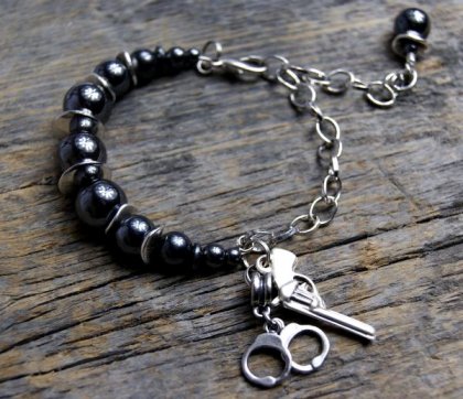 Wykonana została z kulek hematytu w różnych wielkościach oraz elementów posrebrzanych i metalowych (metal antyalergiczny). Całkowita dł bransoletki to ok. 25 cm, dł. części pokrytej koralikami ok. 10 cm. Obwód regulowany.
