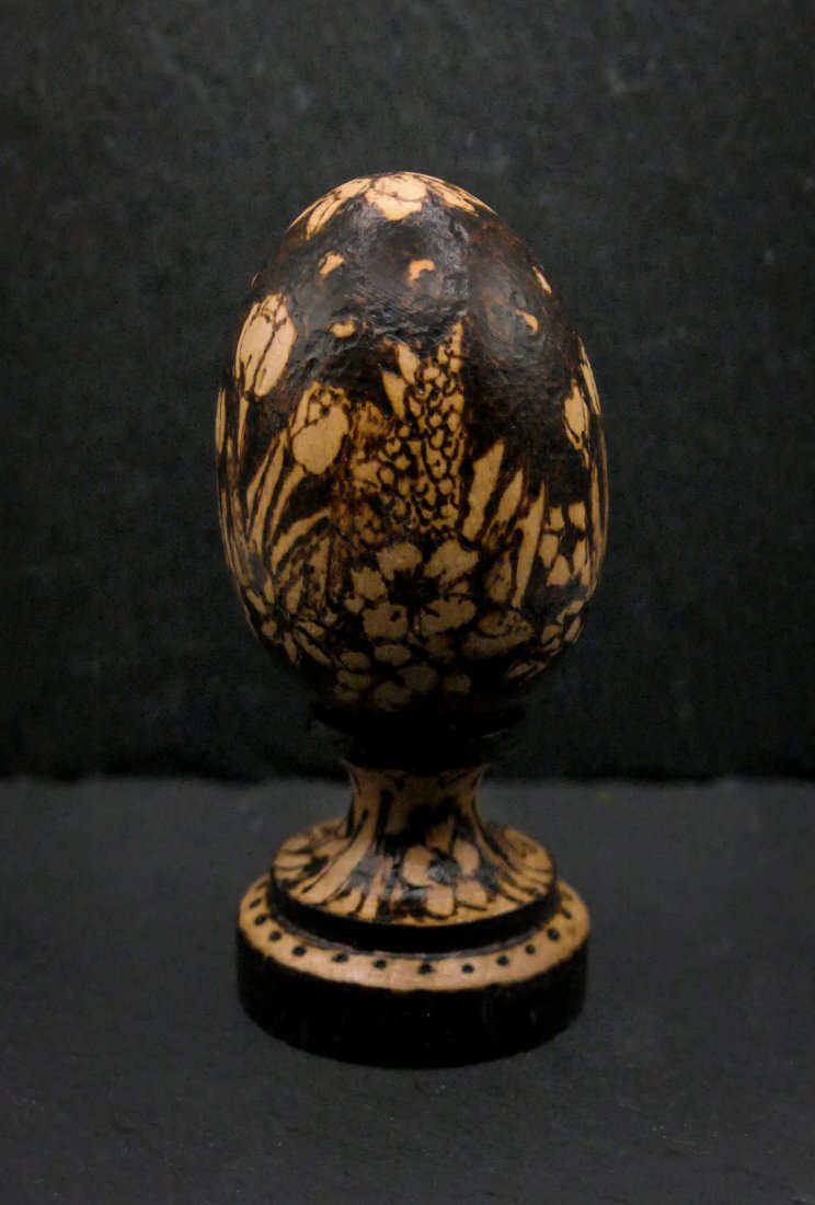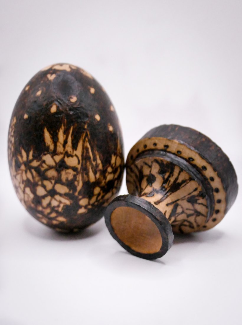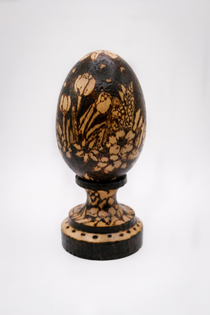 Eleganckie, ręcznie zdobione jajko wielkanocne z naturalnego drewna buku, o wymiarach 6 cm x 4,5 cm, ozdobione abstrakcyjnym wzorem metodą pirografii, bejcowane na jasny dąb.
