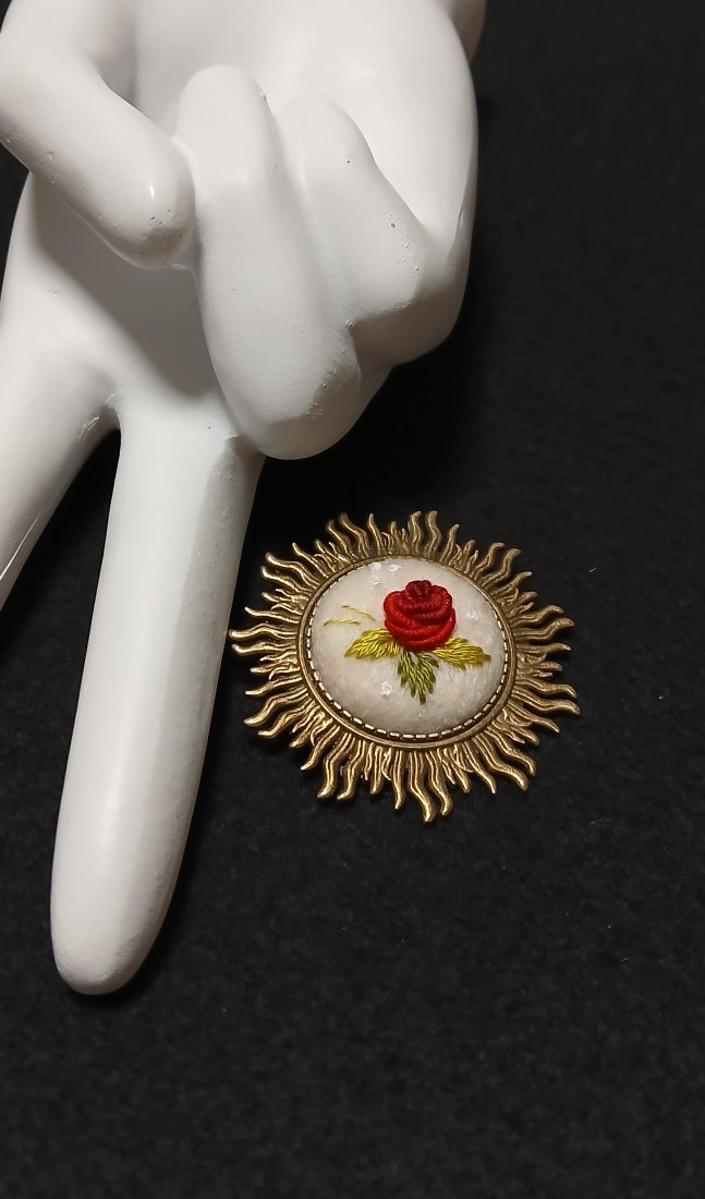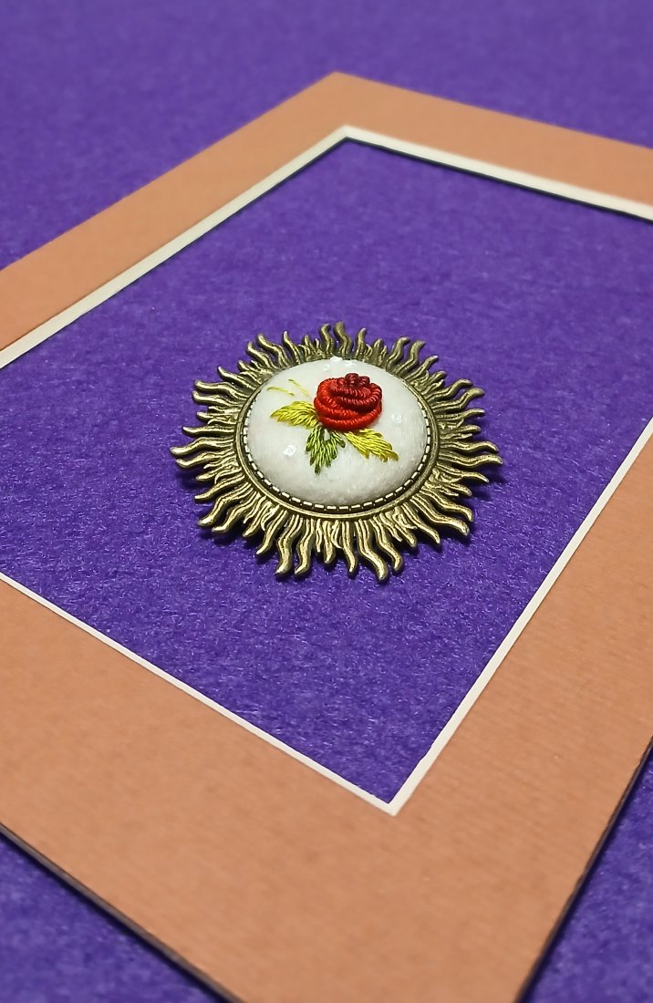 Klasyka kolorystyki - bordo i ecru z dodatkiem bieli tworzy ciekawą broszkę w bazie w formie słońca. Autorski wzór, niespotykany design oraz drobiazgowe wykonanie - niepowtarzalność tkwi w każdym detalu.