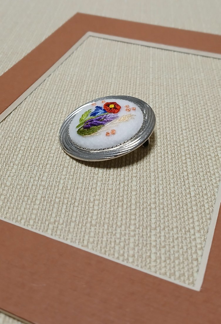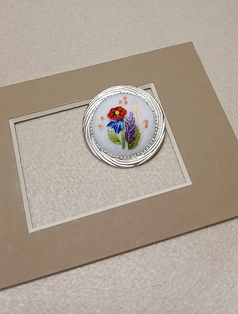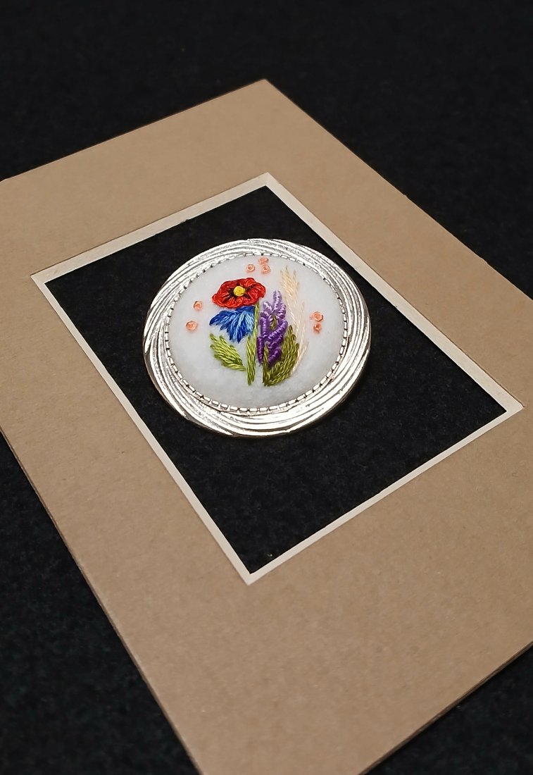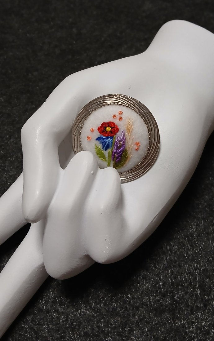 Letni bukiet na białym tle to elegancka okrągła broszka - idealny dodatek do Twojej kreacji. Zepnij nią szal lub chustę albo po prostu wepnij w klapę marynarki, a ona sprawi że poczujesz się wyjątkowo.
