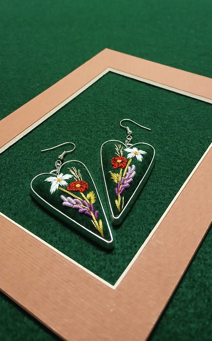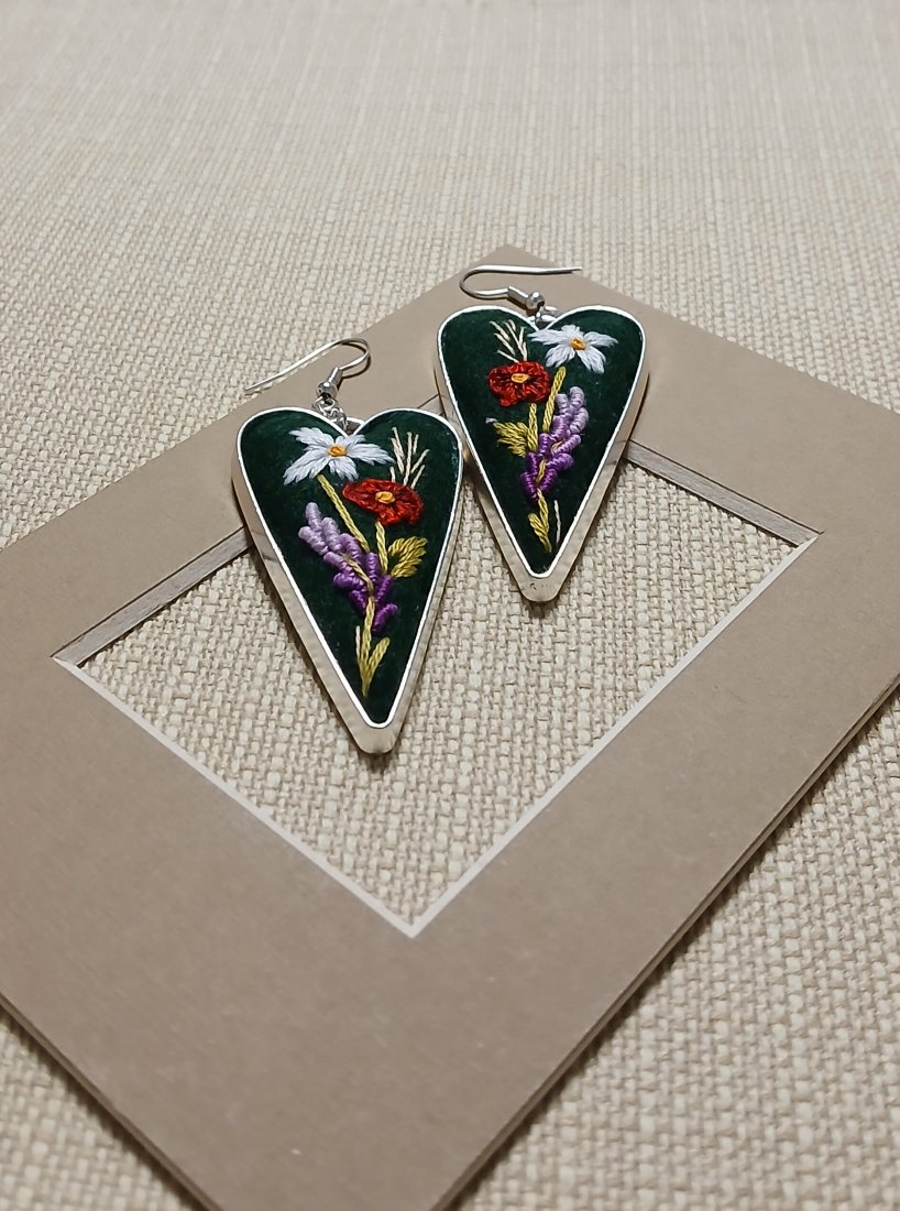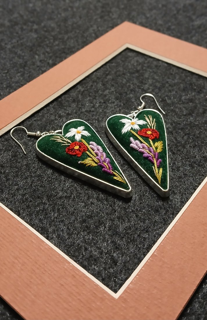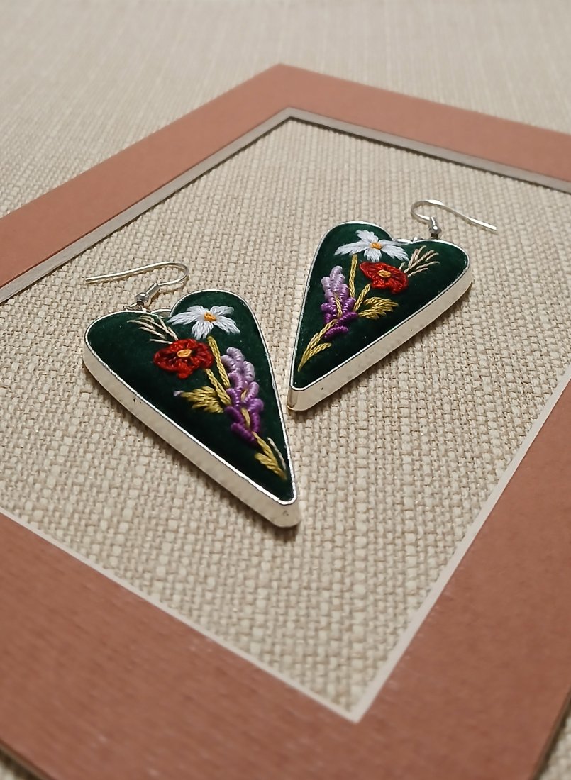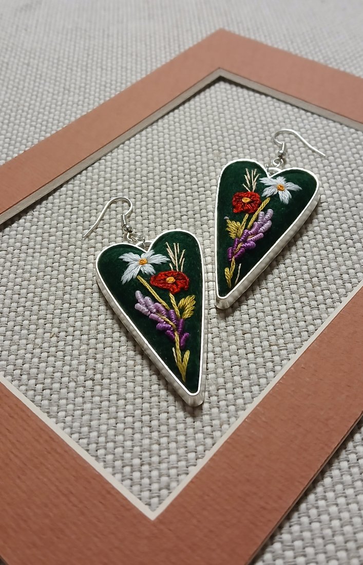 Kolczyki małe, kolczyki duże... Każda z nas lubi inaczej. Jesteś odważna a Twój styl jest niebanalny i oryginalny? Musisz mieć te kolczyki! Duże srebrne serce a na nim ręcznie haftowany bukiet na butelkowej zieleni. To kolczyki które skupiają na sobie uwagę wszystkich!