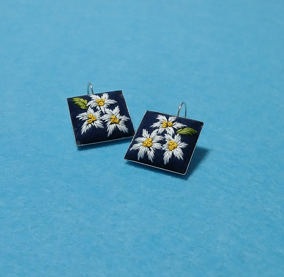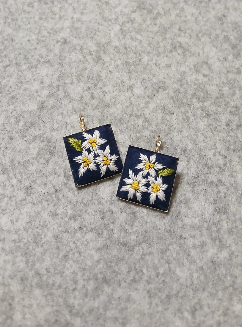 Drobne margaretki na tle pogodnego nocnego nieba, ubrane w kwadrat na sztywnych biglach to kolczyki, które pokochasz. Niepowtarzalny klimat tych kolczyków sprawi że poczujesz się wyjątkowo, czy to na spotkaniu biznesowym czy też na romantycznej randce.