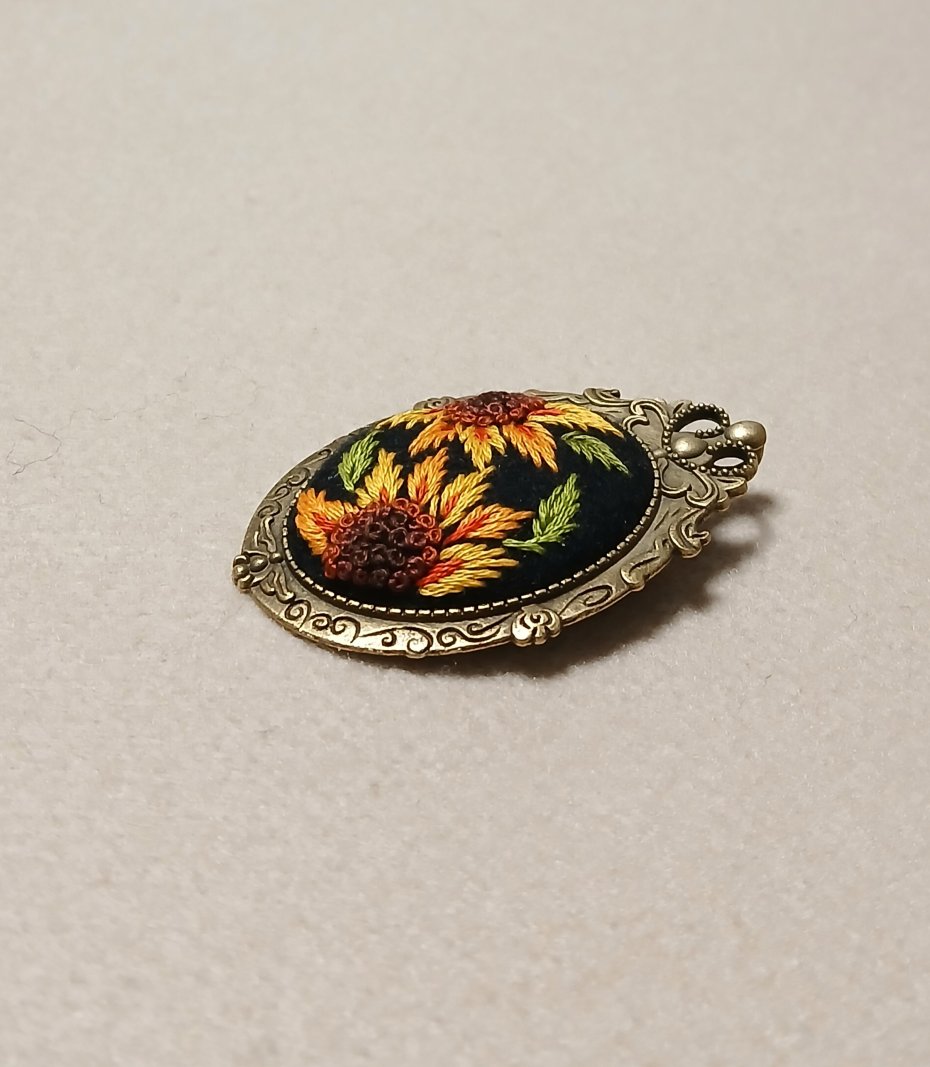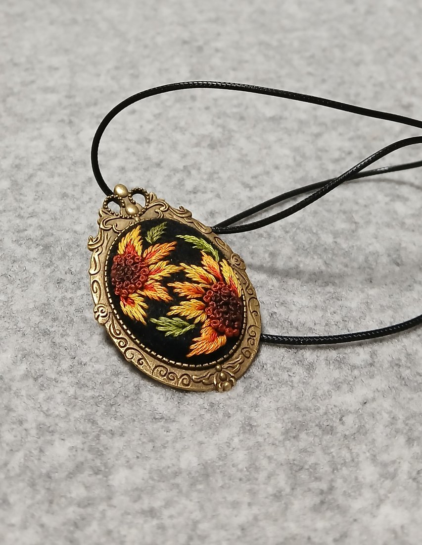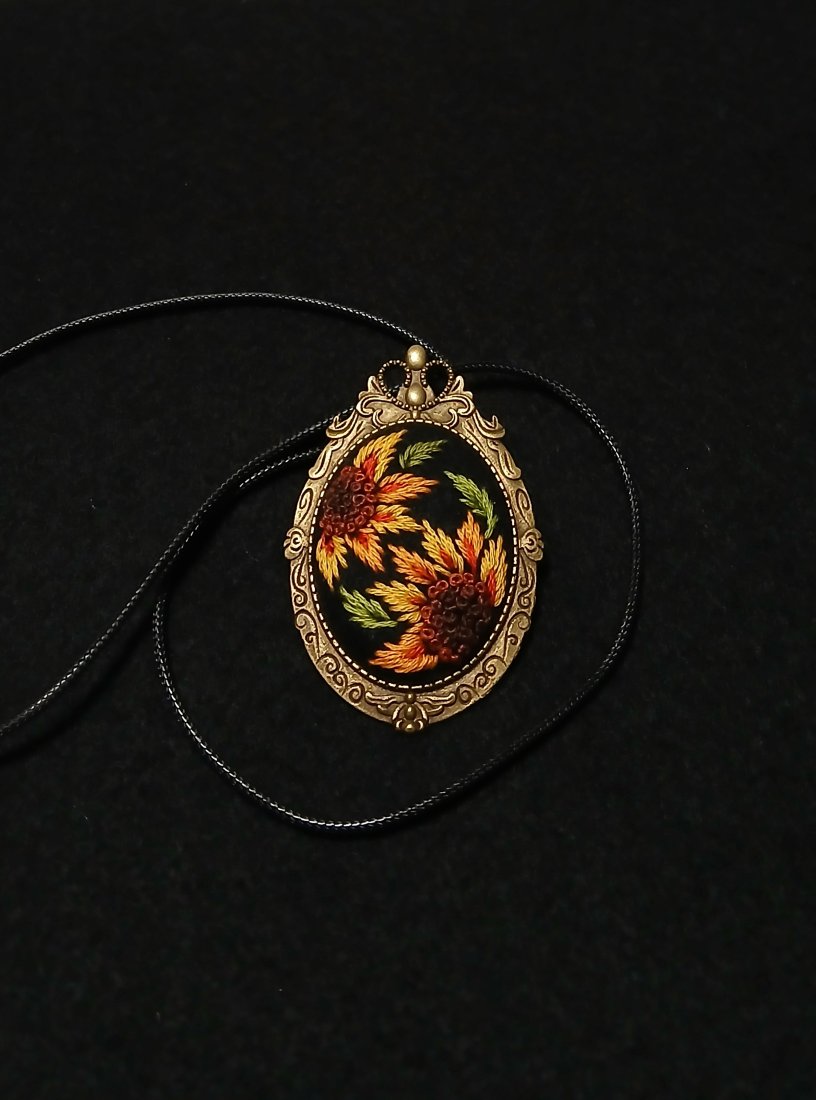 Odkryj urok jesiennej melancholii z precyzją wyhaftowanej na ciekawym broszko-wisiorze. Autorski wzór, niespotykany design. kunsztowne wykonanie. Niepowtarzalność tkwi w każdym detalu. Dodatkowym atutem jest podwójna rola bazy - szpilka i oczko. Możesz spiąć szal jak broszką lub nosić na rzemyku jak wisior.