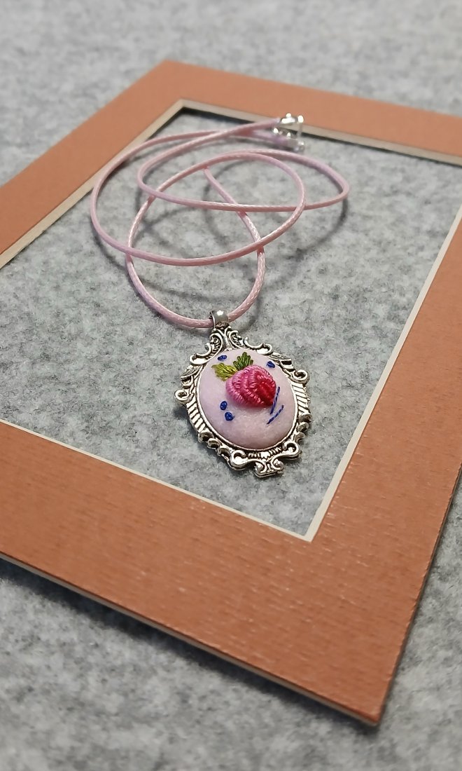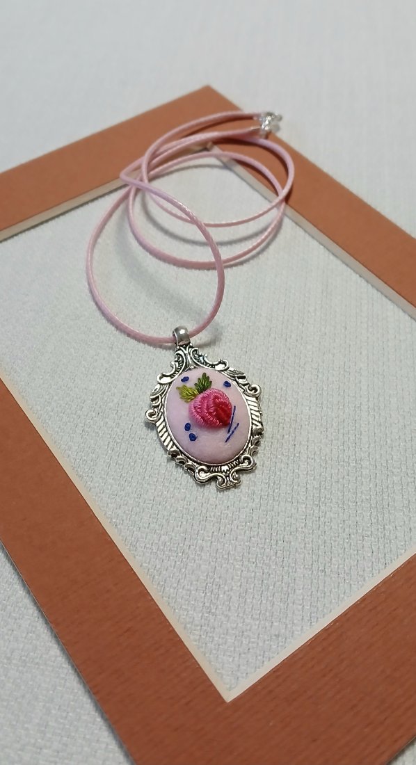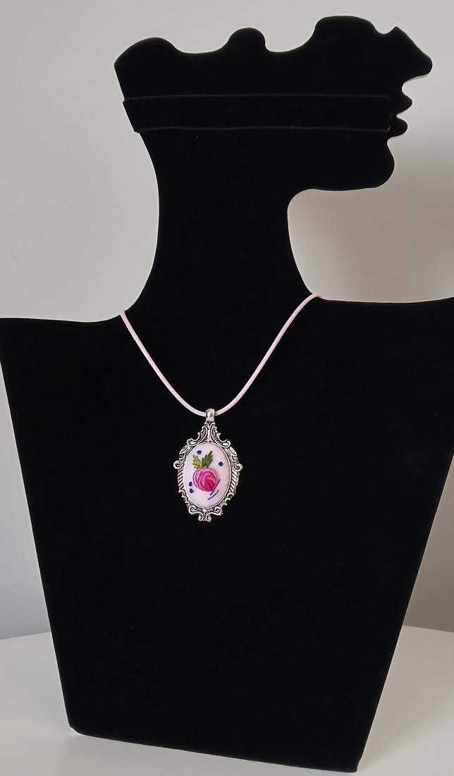 Przesłodki, różowy wisiorek z ornamentem będzie trafionym prezentem dla pań w każdym wieku. Granatowy akcent dodaje pazura i sprawia, że wisior jeszcze bardziej rzuca się w oczy.