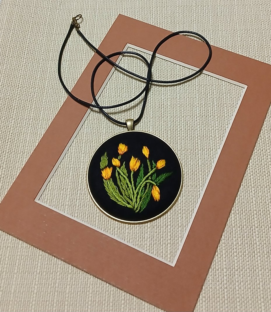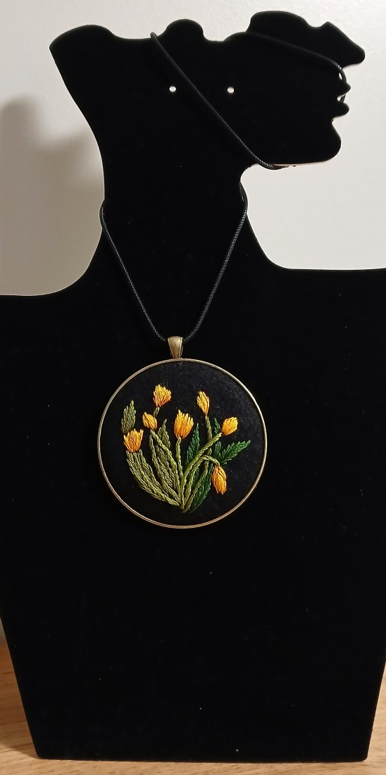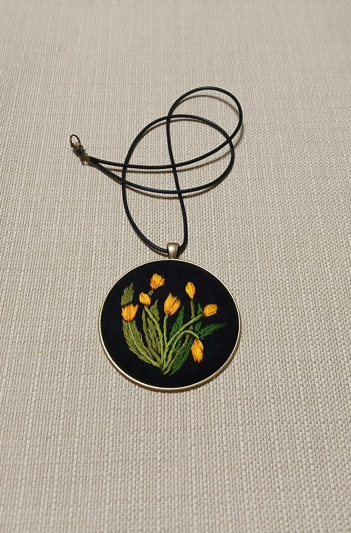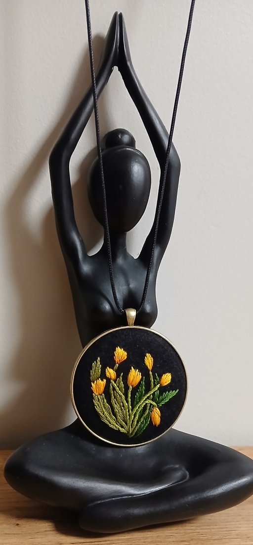 Wisior z duszą. Żółte tulipany i 6 cm średnicy. Ciekawa biżuteria która ma swój charakter dla pań, które lubią się wyróżniać.